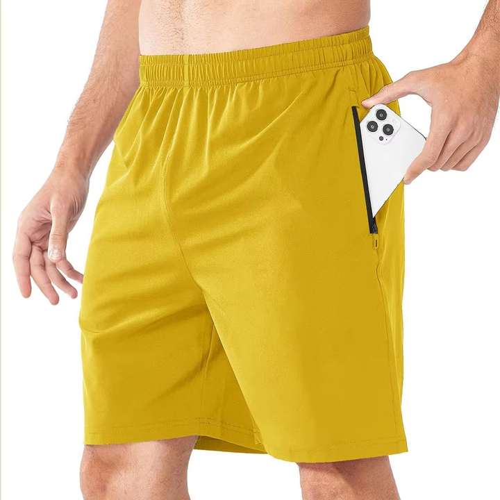 กางเกงขาสั้นออกกำลังกายผู้ชายขายส่ง ระบายอากาศ แห้งเร็ว กางเกงวิ่งออกกำลังกาย โพลีเอสเตอร์ มีกระเป๋าซิป ชุดกีฬาแบบกำหนดเอง