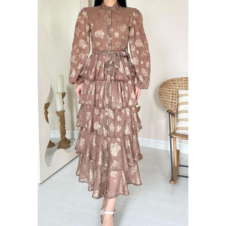 เดรสชีฟองลายดอกพิมพ์ลายทางทรงเอไลน์เอวสูงคอโอแบบซ้อนชั้นสไตล์มินค์ขายส่ง เหมาะสำหรับใส่ลำลองในชีวิตประจำวัน