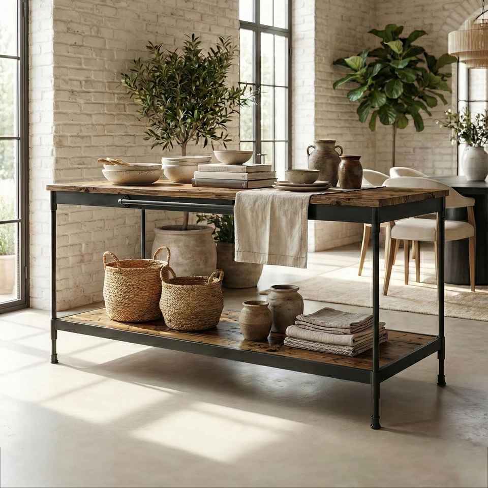 โต๊ะคอนโซลเหล็กทำมือสไตล์โมเดิร์นพร้อมท็อปไม้จริงและชั้นวางของ สำหรับทางเข้าบ้าน ห้องนั่งเล่น สไตล์รัสติกอินดัสเทรียล ขายส่ง