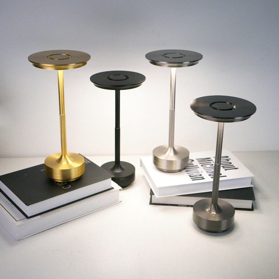 โคมไฟตั้งโต๊ะแบบพกพาสำหรับร้านอาหารและโรงแรมทันสมัย ใช้แบตเตอรี่แบบสัมผัส ไฟ LED ขนาดเล็ก วัสดุโลหะอะลูมิเนียม ชาร์จไฟได้ผ่านพอร์ต USB