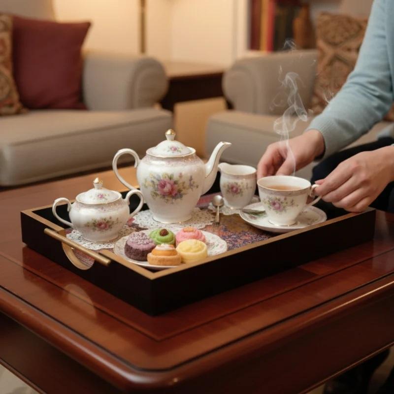 ถาดไม้เคลือบลายพิมพ์ทันสมัยพร้อมหูจับ สำหรับห้องนั่งเล่น ของใช้ในบ้าน ของขวัญสุดพิเศษ ขายส่ง