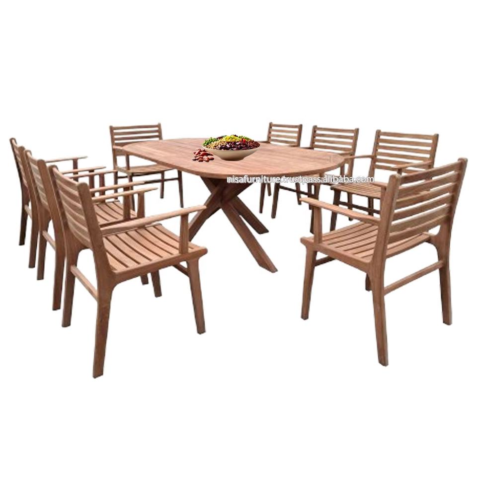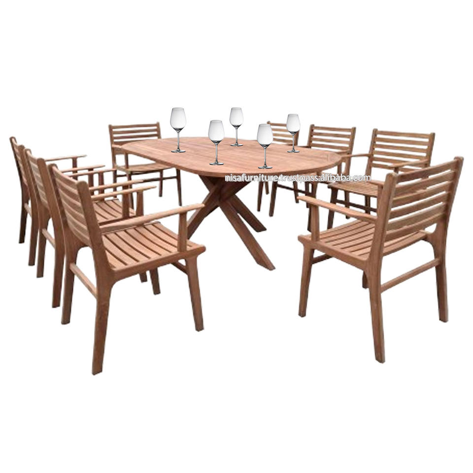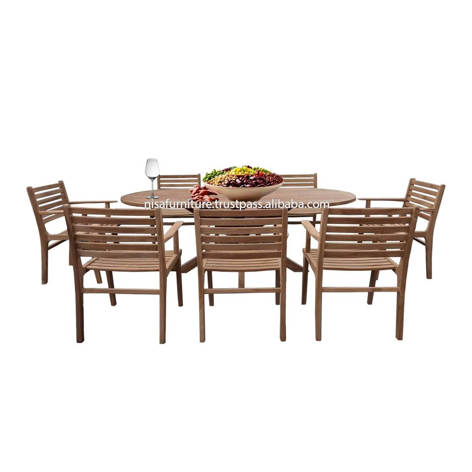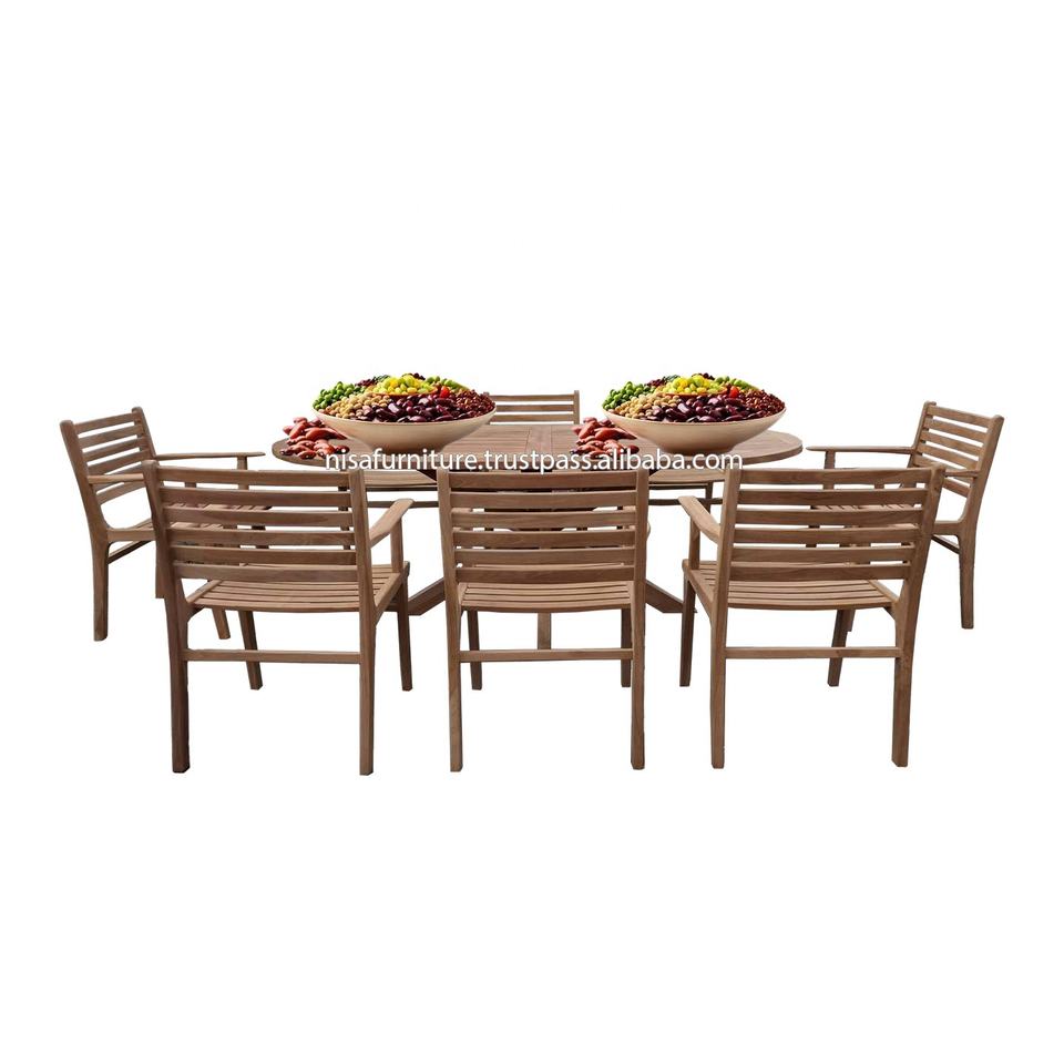 เฟอร์นิเจอร์ไม้สักทันสมัยสำหรับลานบ้าน น้ำหนักเบา ทนทาน ขายส่ง เก้าอี้แบบซ้อนได้ และโต๊ะรับประทานอาหารทรงวงรี สำหรับวิลล่าในอินโดนีเซีย