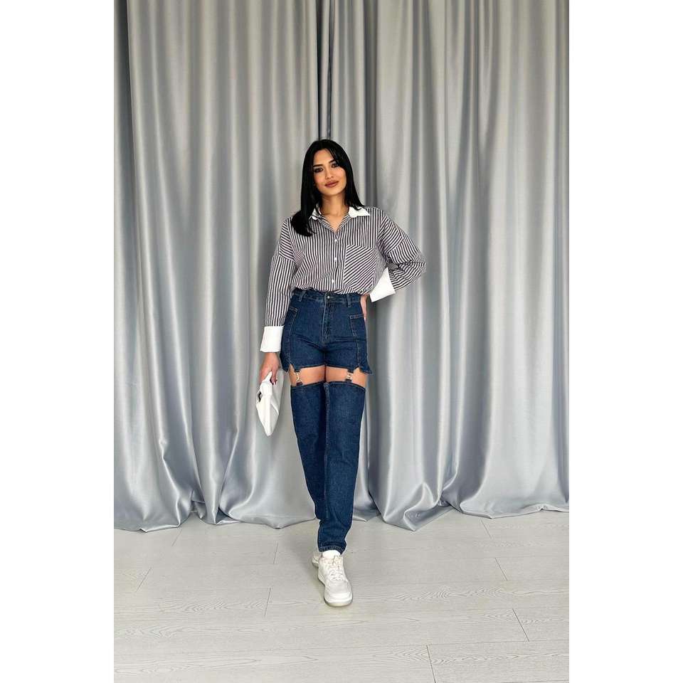 ชุดยีนส์สองชิ้นสีน้ำเงินสไตล์วินเทจแบบเรียบง่าย ขายส่ง พร้อมสายรัด ปักโลโก้ ดีไซน์ผ่าข้าง ล้างสีแบบพิเศษ สำหรับฤดูใบไม้ผลิ