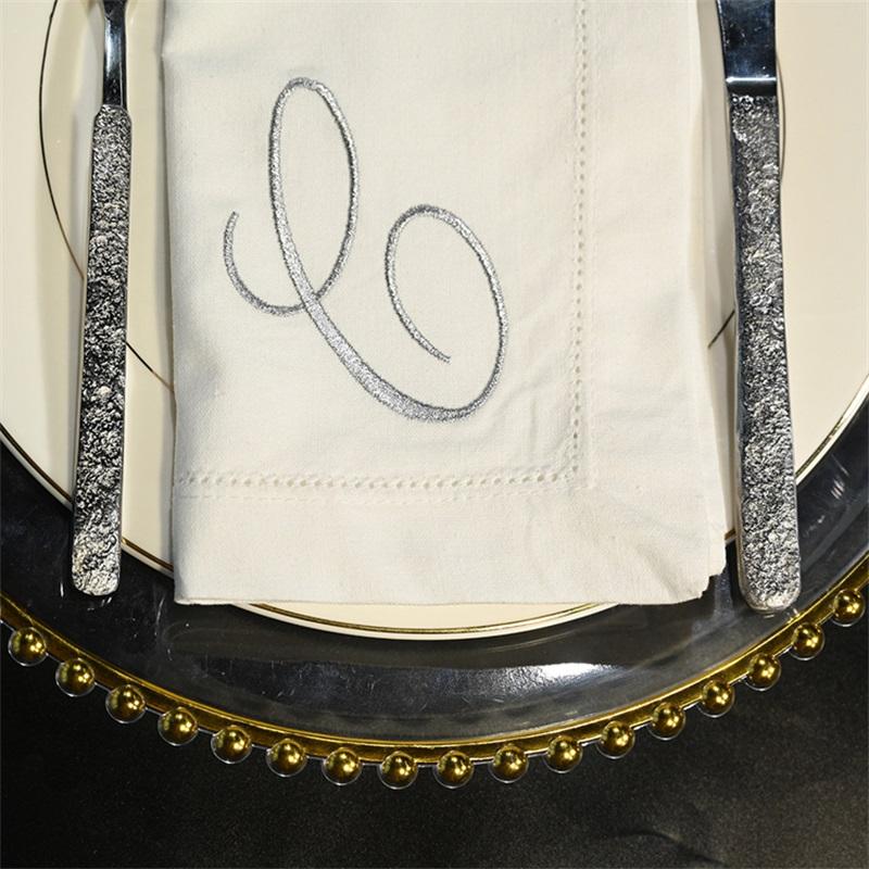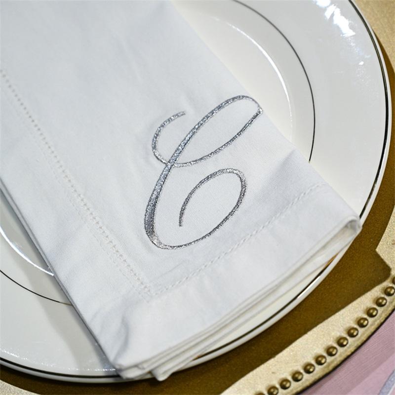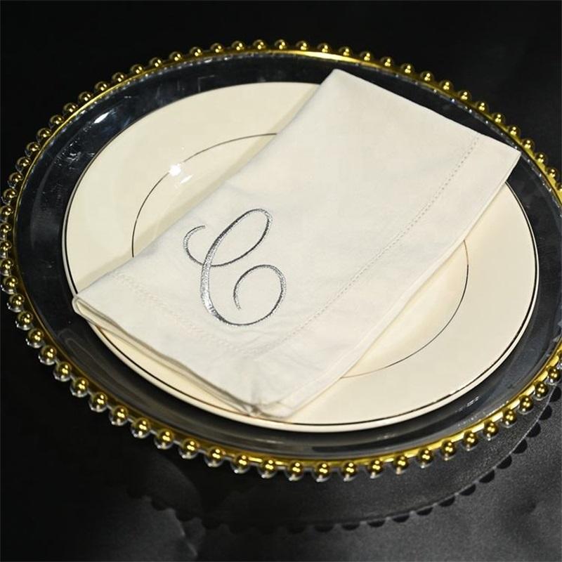 ผ้าเช็ดปากผ้าลินินผสมฝ้ายพร้อมโลโก้สำหรับงานแต่งงานร้านอาหารผ้าปูโต๊ะค็อกเทลสีขาวปักลายแบบกำหนดเอง