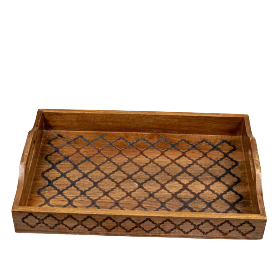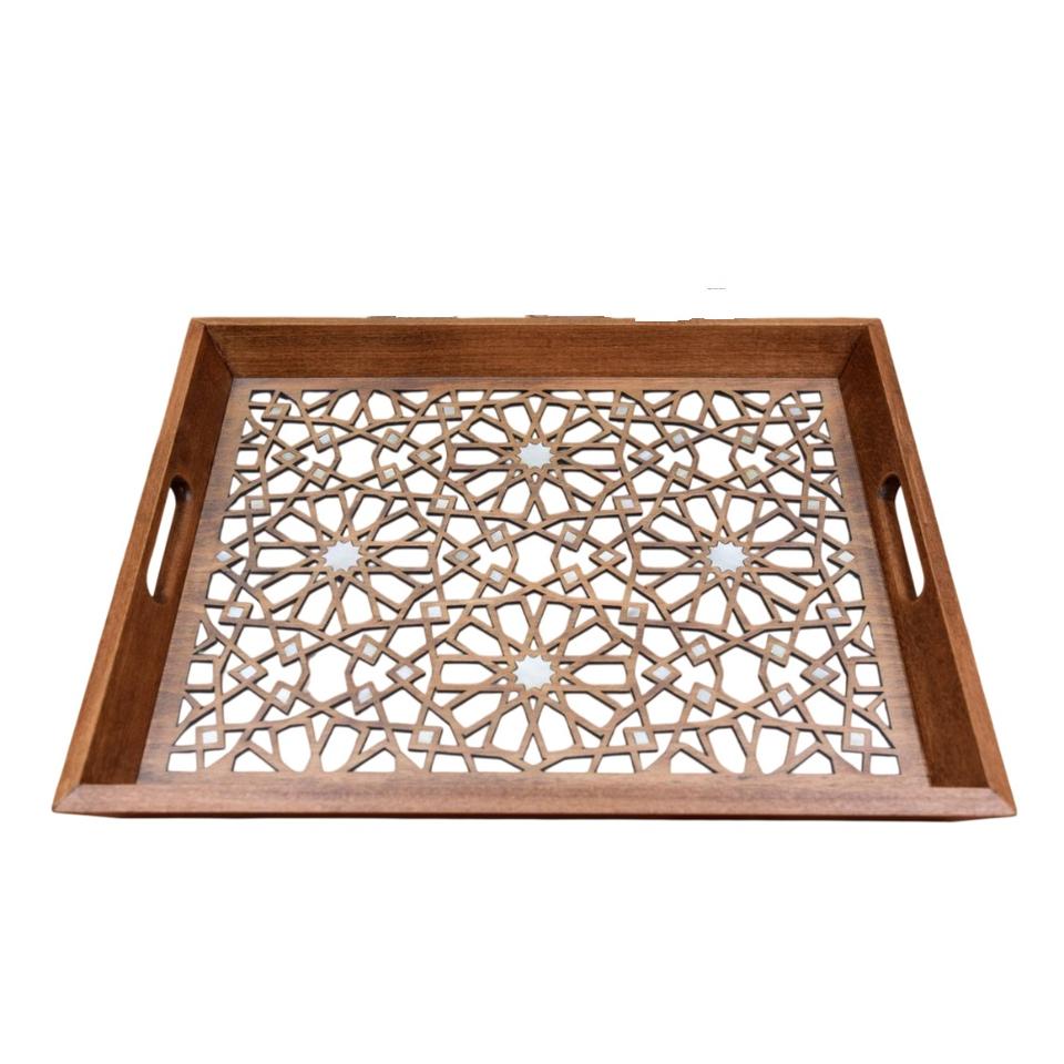 ถาดเสิร์ฟไม้สไตล์โมร็อกโกขายส่ง งานแฮนด์เมด ลายฉลุเลเซอร์รูปทรงเรขาคณิต ถาดตกแต่งสำหรับชาและกาแฟ พร้อมฐานแก้ว