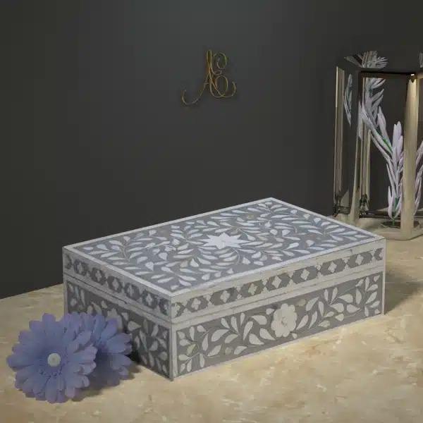 กล่องใส่เครื่องประดับฝังมุกเปลือกหอยรูปทรงสี่เหลี่ยมผืนผ้า – ผู้ผลิตและส่งออกกล่องเก็บของตกแต่งลายดอกไม้ทำมือจากเปลือกหอย