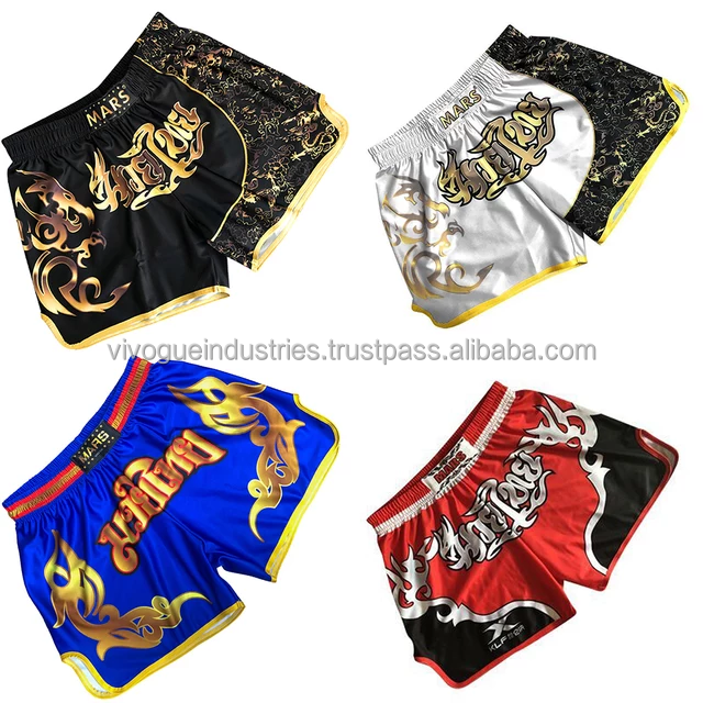 กางเกงมวยไทยขายส่ง ทนทาน ผลิตจากโพลีเอสเตอร์ 100% น้ำหนัก 220 กรัม พิมพ์ลายแบบซับลิเมชั่น ด้านหน้าสามารถสกรีนโลโก้ได้ตามต้องการ เหมาะสำหรับทุกเพศทุกวัย แฟชั่นสำหรับออกกำลังกาย