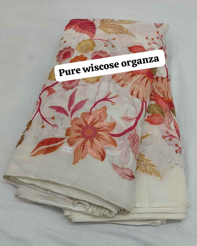 ผ้าวิสโคสแท้ Chanderi ขายส่ง ความกว้าง 58 นิ้ว น้ำหนักเบา 60 GSM ลายดอกหลากสี งานปักดิ้นหลายเส้น จากโรงงาน