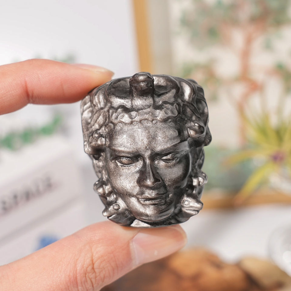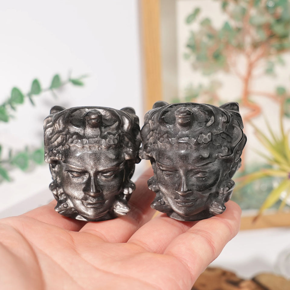 หินออบซิเดียนสีเงินธรรมชาติแกะสลักหัวเมดูซ่า งานแกะสลักด้วยมือ รูปปั้นคริสตัลตำนานเทพเจ้ากรีก สำหรับตกแต่งบ้านและใช้ในพิธีกรรมทางแม่มด