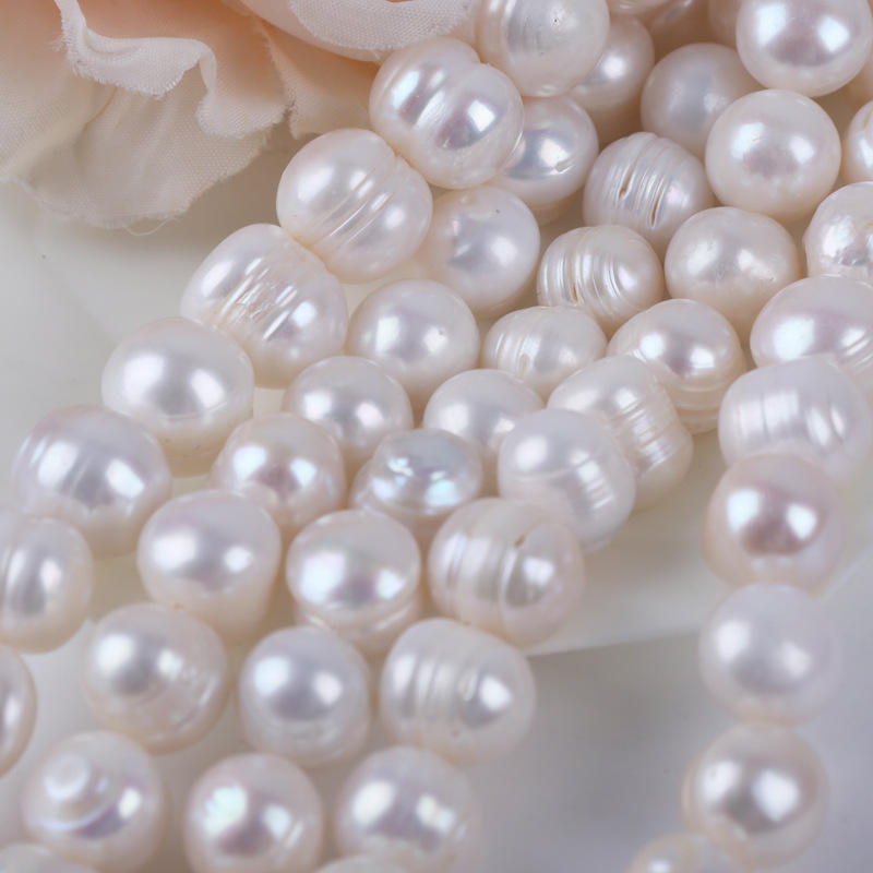 ไข่มุกน้ำจืดธรรมชาติสีขาว ขนาด 18 ซม. ร้อยเป็นเส้น ร้อยละ 98 ใกล้เคียงกับทรงกลม ขนาด 12-13 มม. ไข่มุกหลวมจากจูจี้