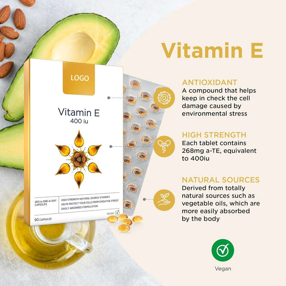 วิตามินอีธรรมชาติบริสุทธิ์ 400lU สารสกัดเสริมอาหาร โทโคไตรอีนอล 300 มก. แบบซอฟต์เจล เสริมสร้างภูมิคุ้มกัน สุขภาพผิวสำหรับทารกแรกเกิด