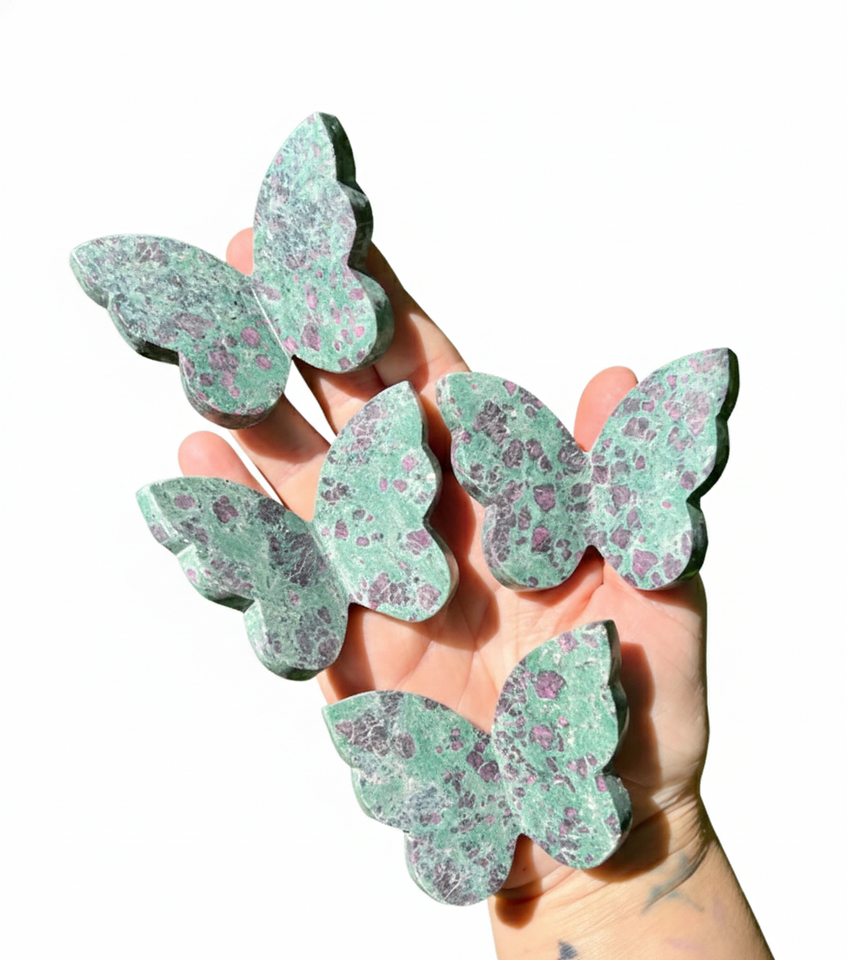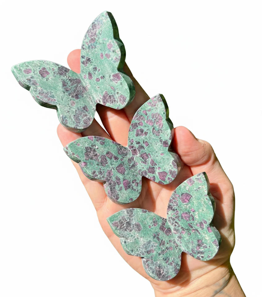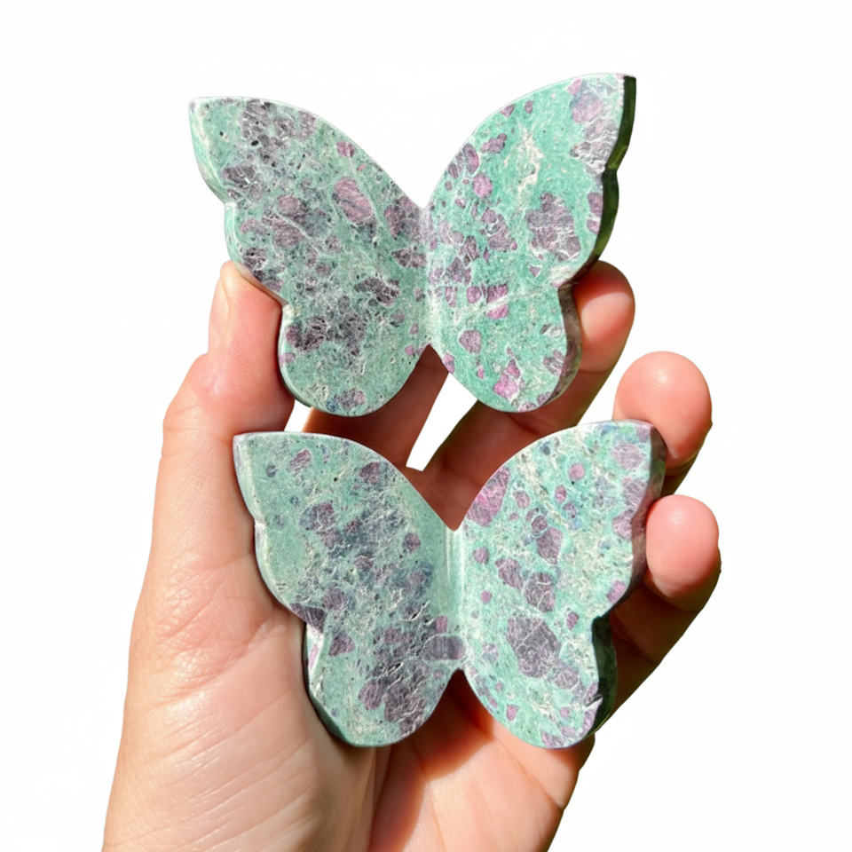 หินฟุชไซต์ทับทิมธรรมชาติแกะสลักปีกผีเสื้อ 3 มิติ หินพลังงานบำบัด ตัวอย่างแร่ธาตุ ของตกแต่งสำนักงาน ขายส่ง