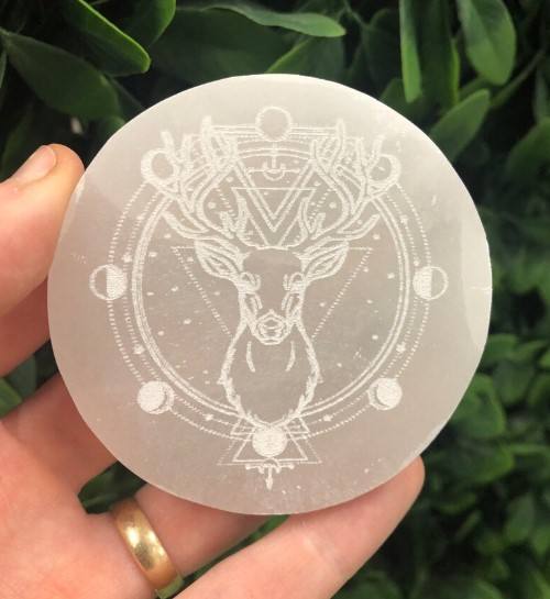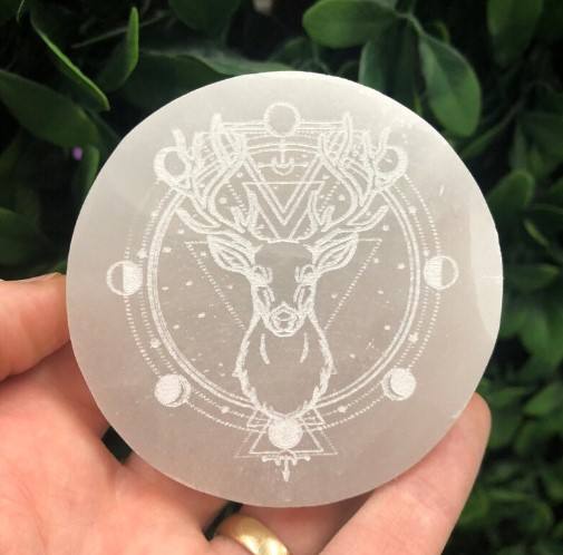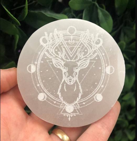 แผ่นเซเลไนต์ธรรมชาติขายส่ง ลายแกะสลักรูปกวางตามหลักฮวงจุ้ย ใช้เป็นแผ่นรองชาร์จ จานรองแก้ว ของตกแต่งบ้านด้วยอัญมณี