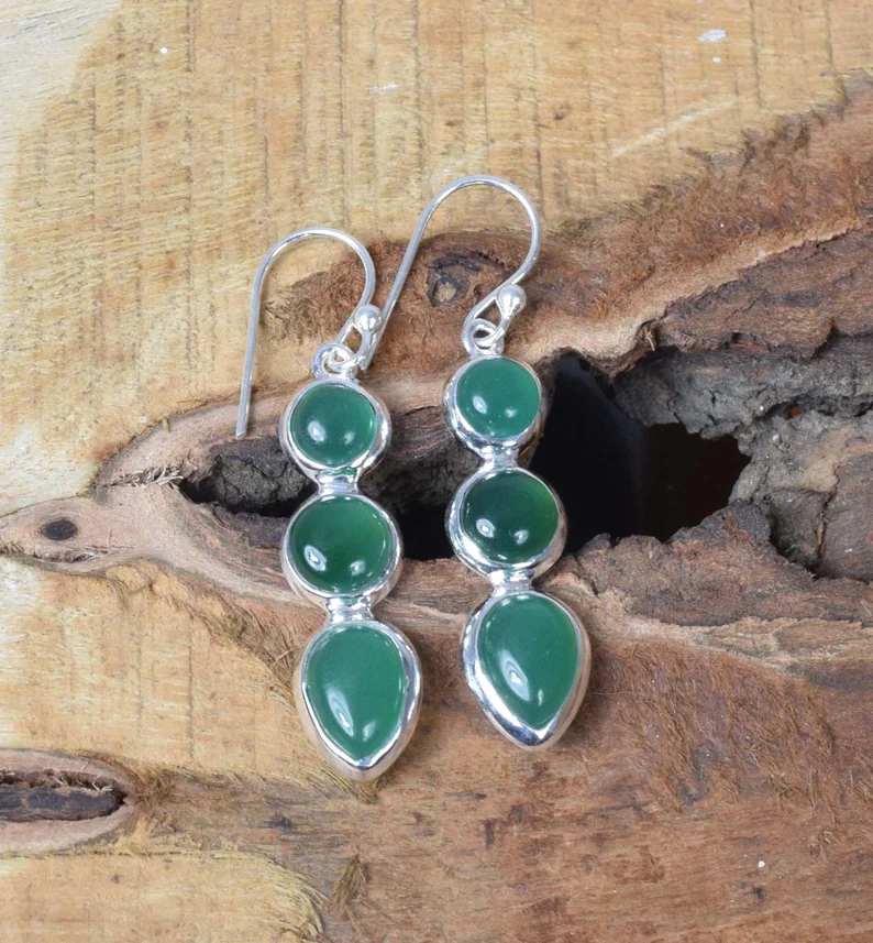 ขายส่งขายส่งหินธรรมชาติสีเขียวนิล925เงินสเตอร์ลิงทำด้วยมือตะขอสง่างามลดลงเครื่องประดับหิน3ต่างหูราคาโรงงาน