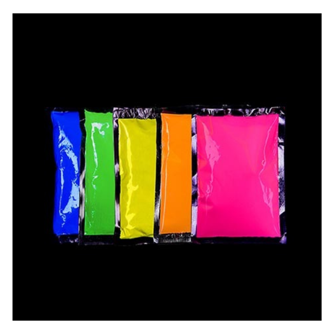 ผงสีนีออนเรืองแสงเนื้อเนียนละเอียด ไม่มีสารเคมีรุนแรง บรรจุภัณฑ์ 100 กรัม–2 กิโลกรัม สำหรับใช้ในชุดกีฬาและป้ายโฆษณา