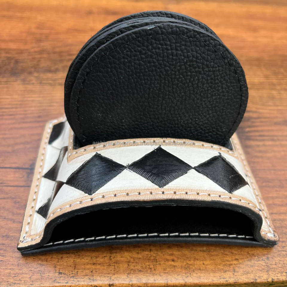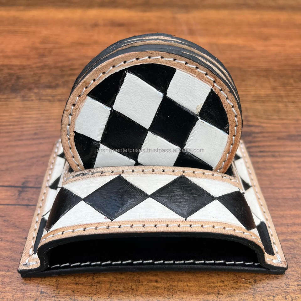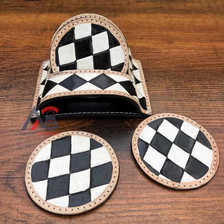 ชื่อผลิตภัณฑ์:ที่รองแก้วหนังแท้พร้อมชุดจานรองแก้วลายตารางหมากรุก
