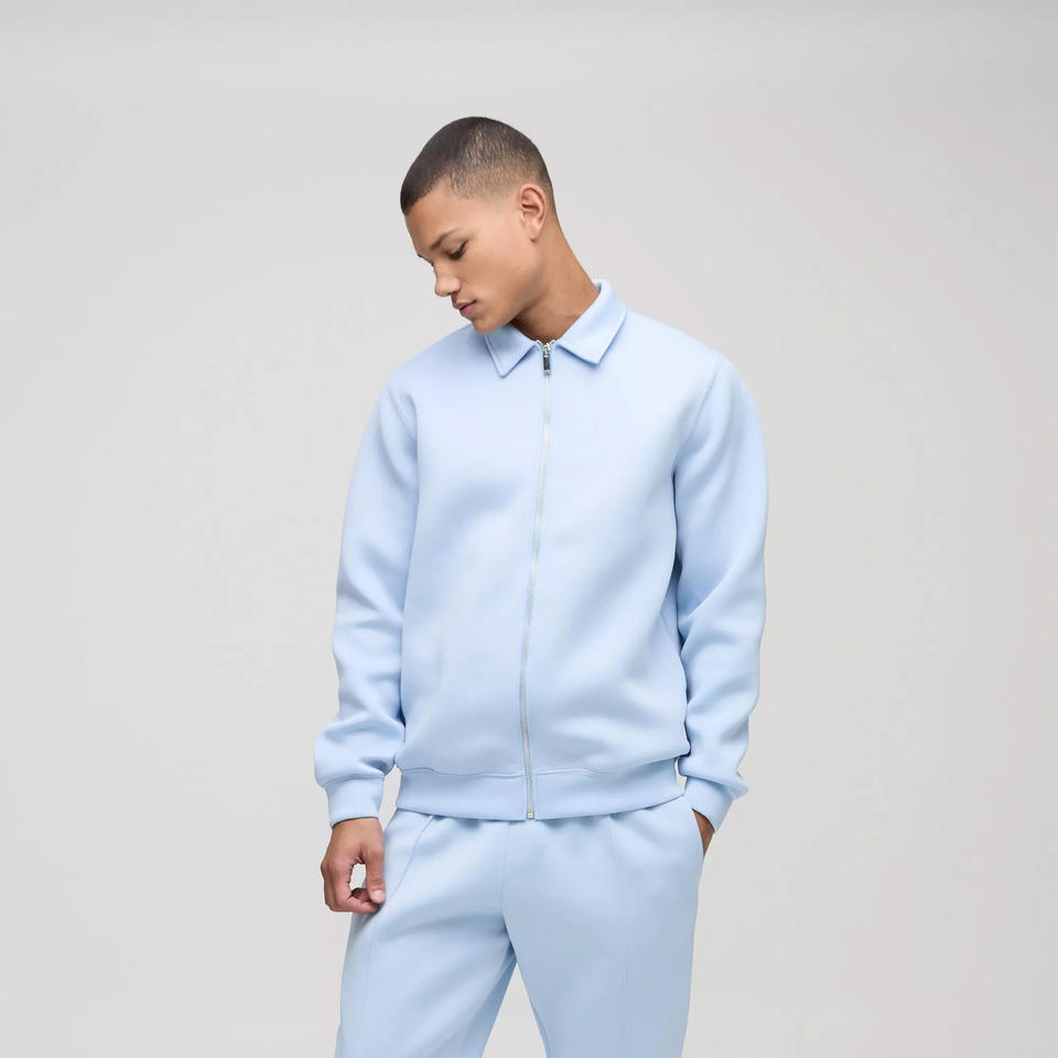 ชุดกีฬากันหนาวสำหรับผู้ชายชุดวอร์มเสื้อแจ็กเก็ตแฮร์ริงตันผูกมัดสีฟ้าอ่อนทันสมัย