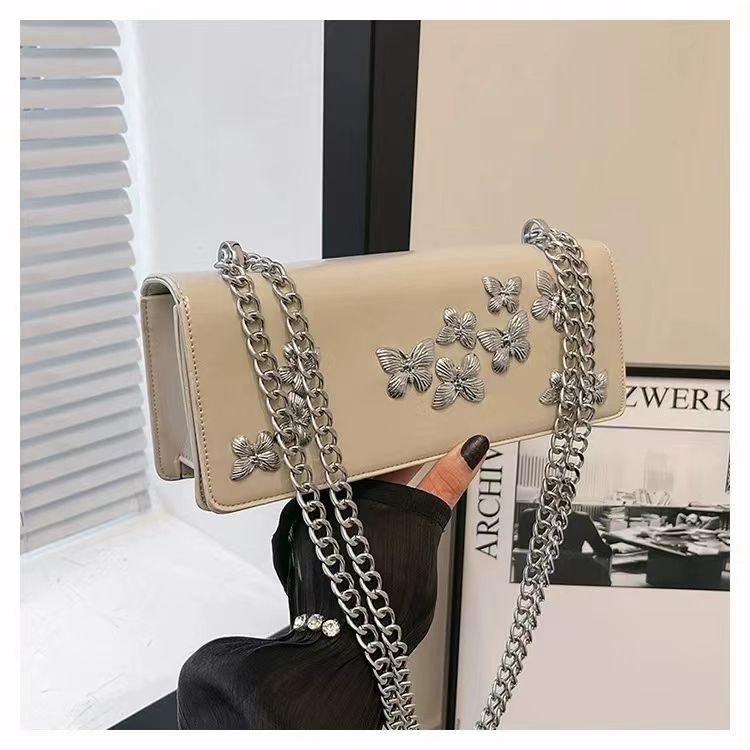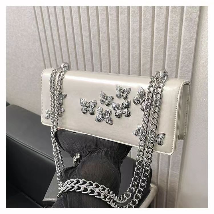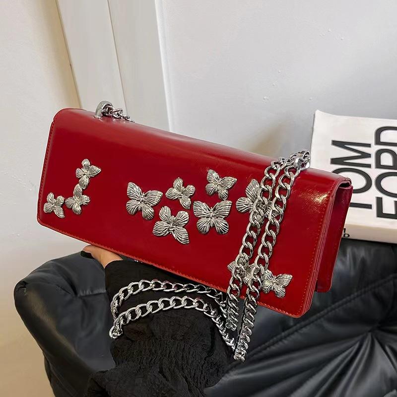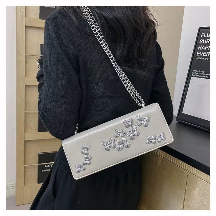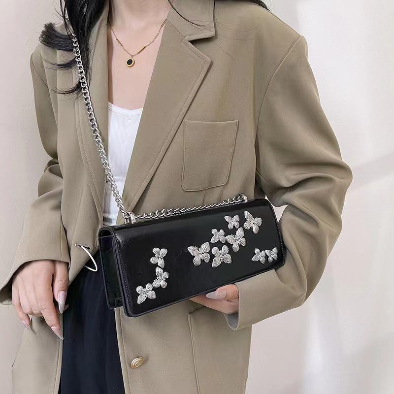กระเป๋าหนัง PU สะพายข้างสำหรับผู้หญิงดีไซน์ใหม่กระเป๋าสะพายไหล่ทรงสี่เหลี่ยมลายผีเสื้อ