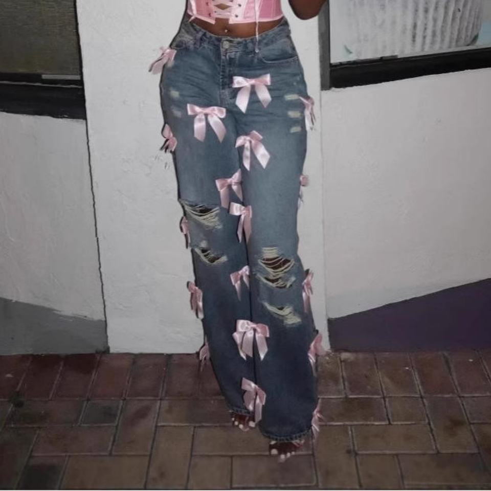 กางเกงยีนส์สตรีสไตล์วินเทจดีไซน์ใหม่ขายส่ง ผ้าฝ้าย 100% ล้างสีแบบแอซิด แต่งรอยขาด ปะโบว์ ทรงหลวม