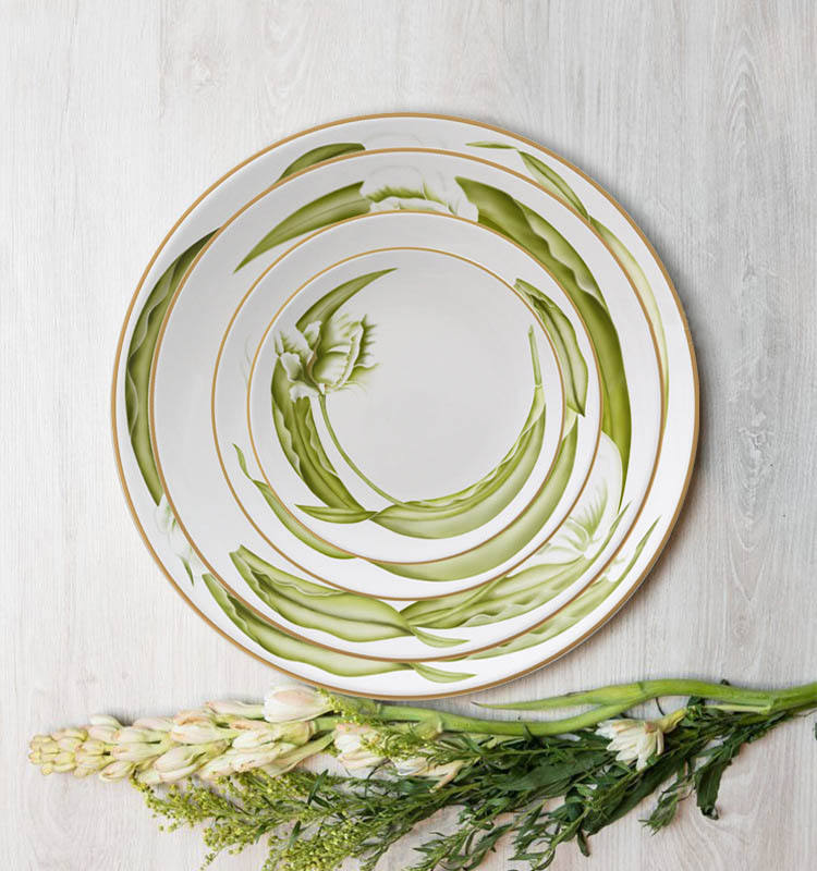 ชุดจานอาหารเซรามิกสำหรับงานเลี้ยงอาหารค่ำชุดจานเซรามิกลายดอกไม้ถั่วลันเตาสำหรับงานแต่งงานดีไซน์ใหม่
