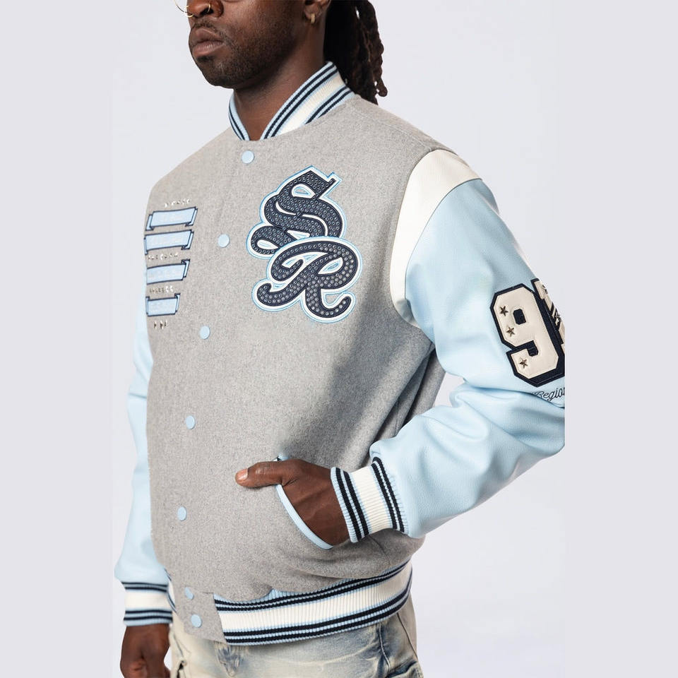 แจ็คเก็ตวาร์ซิตี้แฟชั่นใหม่ขายส่ง ผ้าฝ้าย 100% เป็นมิตรกับสิ่งแวดล้อม สำหรับผู้ชาย ปิดซิป มีกระเป๋า แจ็คเก็ตเบสบอลสไตล์ Letterman สำหรับวิทยาลัย