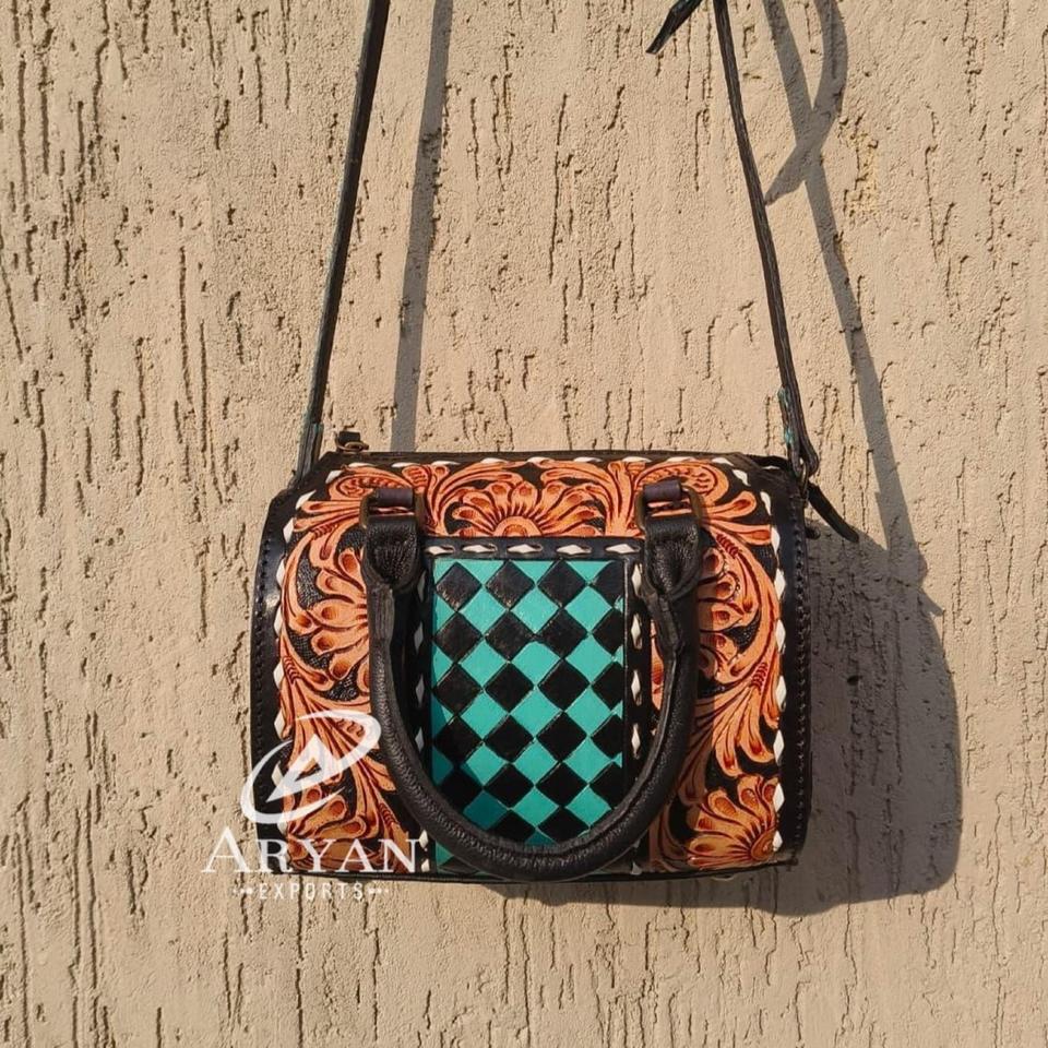 Hand Tooled Checkered Leather Speedy Duffel Bag