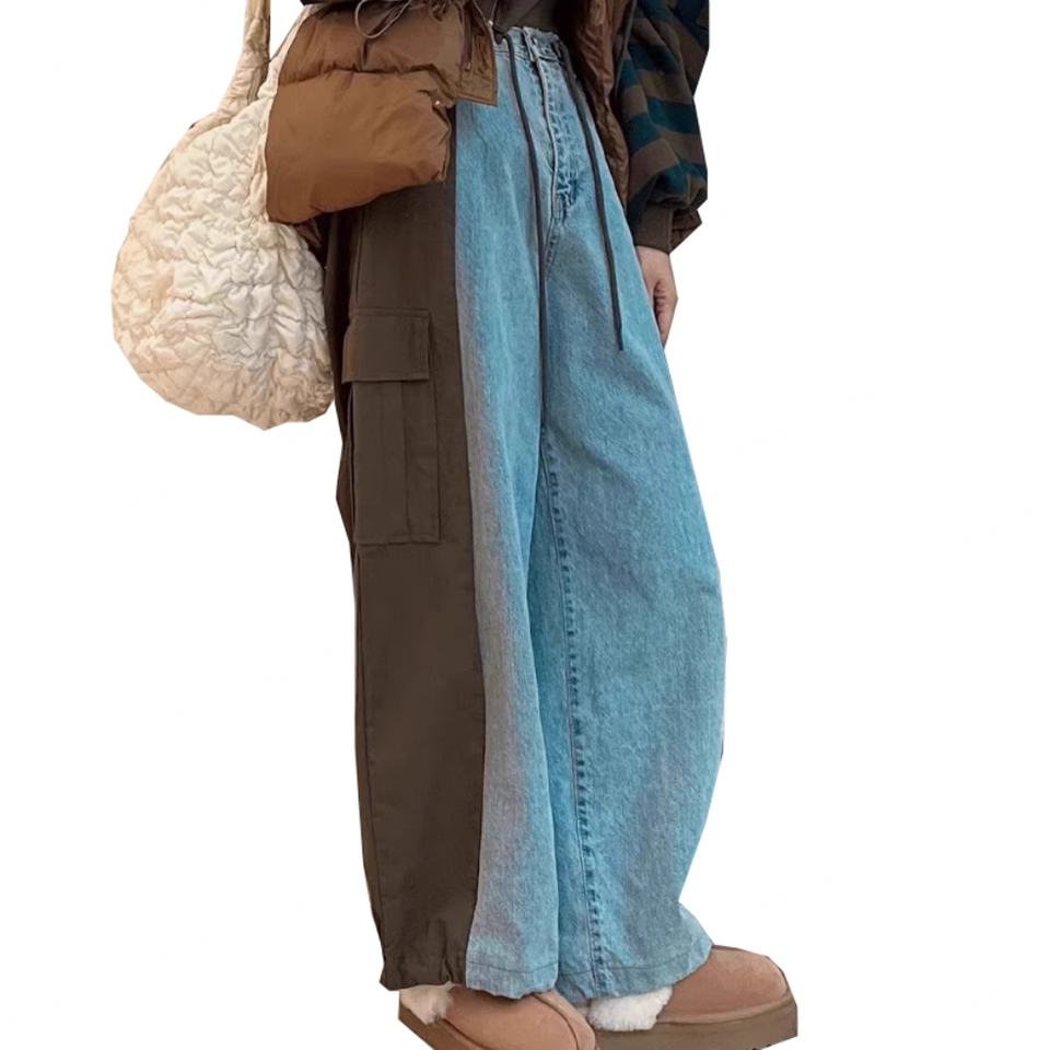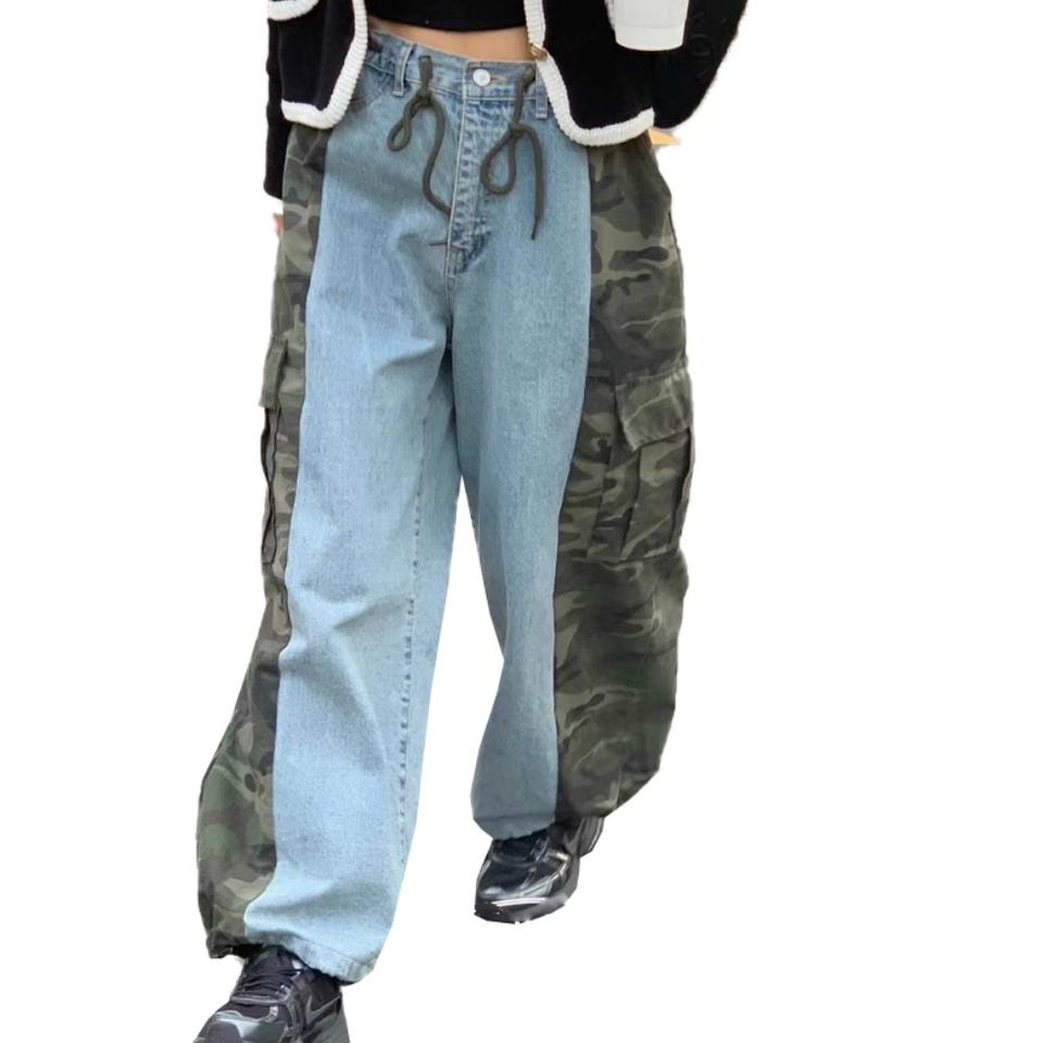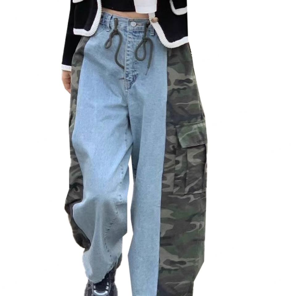 กางเกงยีนส์ขากว้างแบบมีเชือกผูกเอว แต่งลายพรางด้านข้าง ดีไซน์เฉพาะตัว หลากหลายสไตล์ ขายส่งแบบใหม่