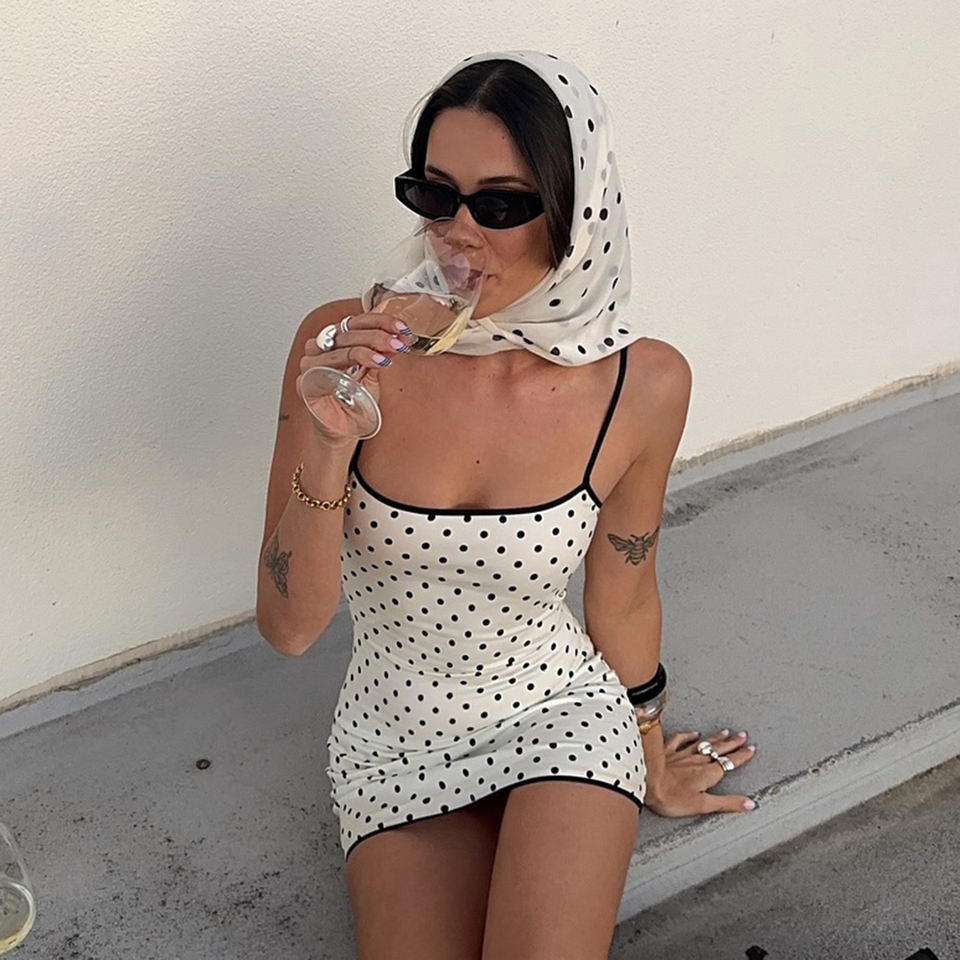 ชุดเดรสสายเดี่ยวพิมพ์ลายจุดหวานๆ สไตล์ลำลองสำหรับผู้หญิง ขายส่งแบบใหม่