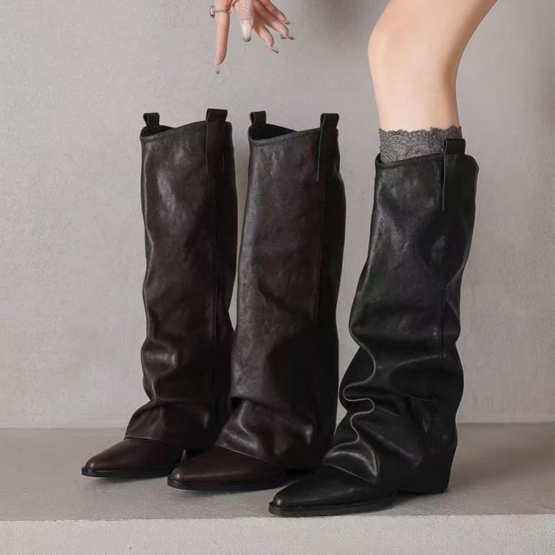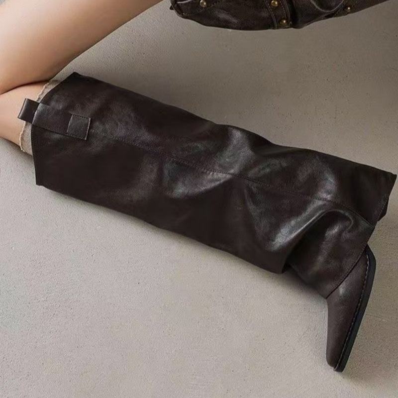 รองเท้าบูทหนังแท้ทรงเรโทร ส้นหนา ปลายแหลม แบบสูงถึงเข่า แฟชั่นผู้หญิง ไม่สูงเกินเข่า ทรงตรง ขายส่ง
