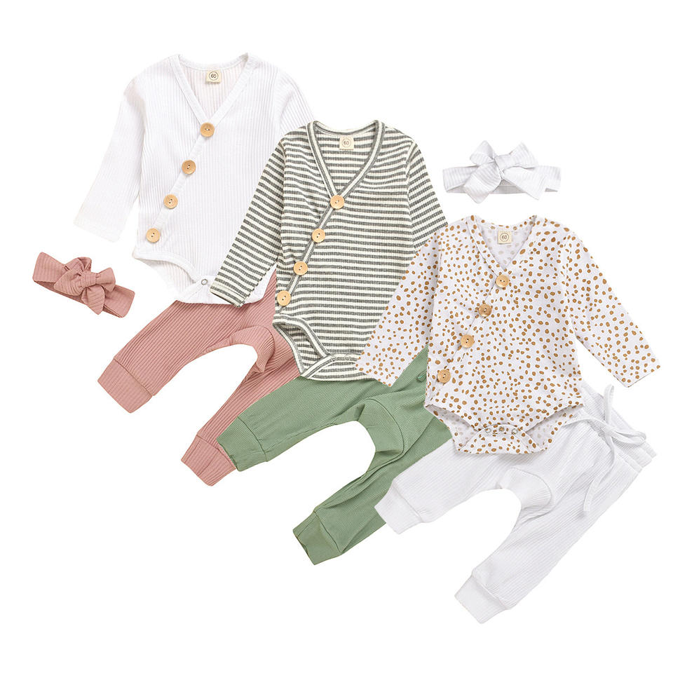 ชุดเสื้อผ้าเด็กแรกเกิดขายส่ง ชุดรอมเปอร์แขนยาว กางเกง ผ้าคาดศีรษะ ผ้าฝ้ายถัก ชุดเด็กผู้หญิง 3 ชิ้น