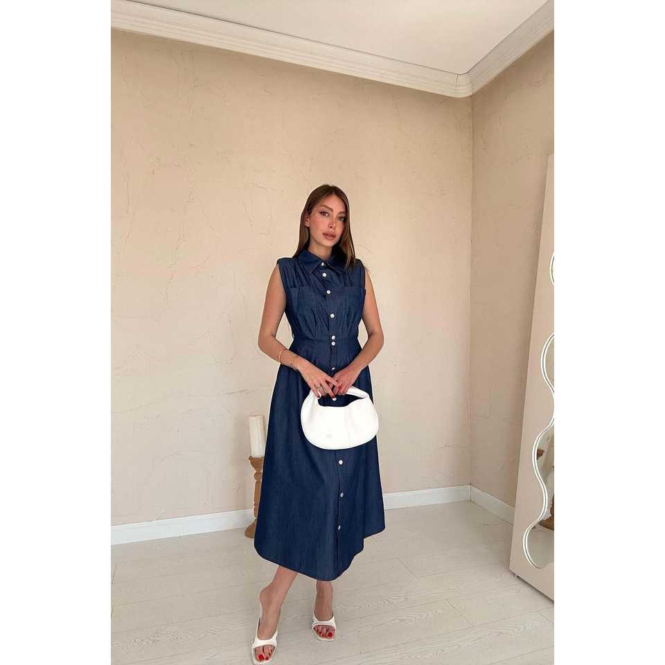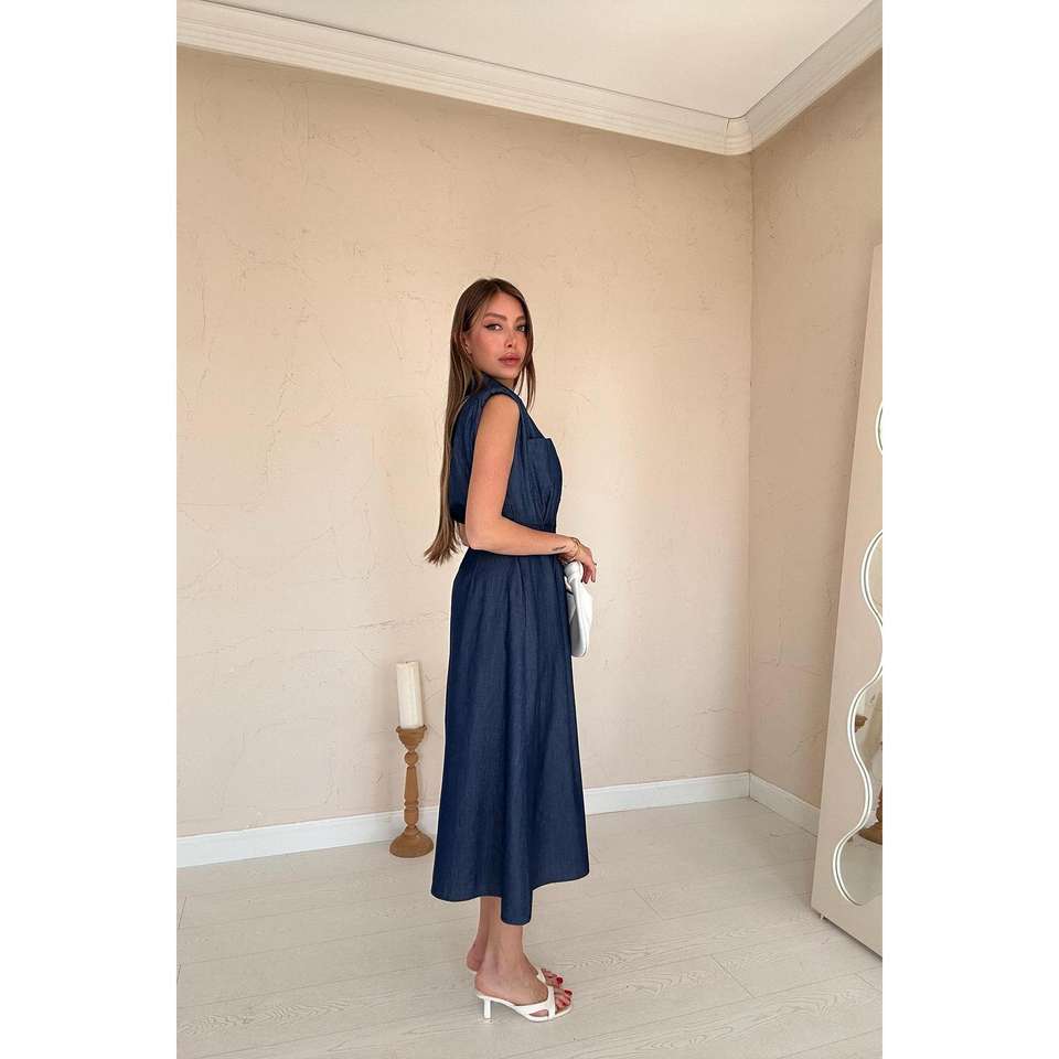 เดรสเทนเซลสีน้ำเงินแบบเรียบง่าย ขายส่ง ODM คุณภาพสูง ลายดอกไม้ พิมพ์ลายเรียบ คอ halter ทรงเดรป ไซส์ XS สำหรับผู้หญิง/สุภาพสตรี สำหรับงานปาร์ตี้กลางวัน
