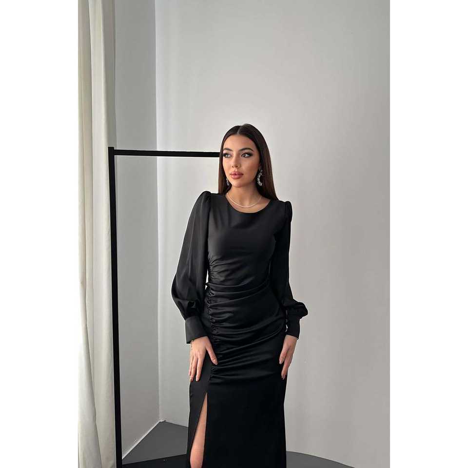 ชุดราตรีผ้าซาตินสีดำสำหรับผู้หญิง ขายส่งแบบ ODM ไซส์ XS คอวี ทรงเอไลน์ ช่วงเอวทรงเอ็มไพร์ จับจีบด้านข้าง ผ่าข้าง