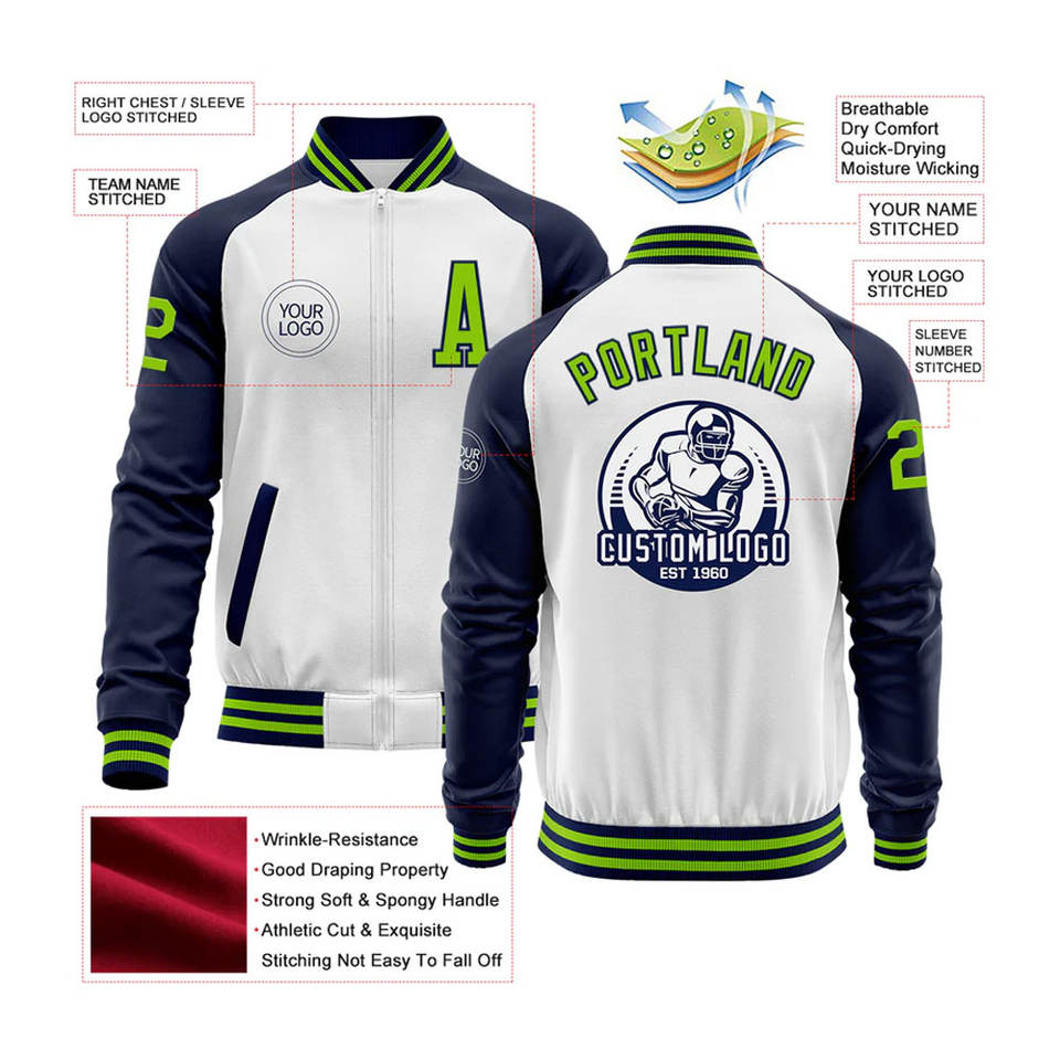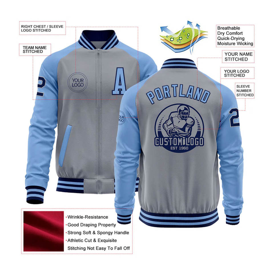 เสื้อแจ็คเก็ตเบสบอลแบบสั่งทำขายส่ง OEM ปักลายแบบ Sublimation กระดุมเต็มตัว แจ็คเก็ต Varsity ผู้ชาย ไซส์ใหญ่ สไตล์ลำลอง คอตั้ง แต่งผ้าแบบ Patchwork ด้านหน้า