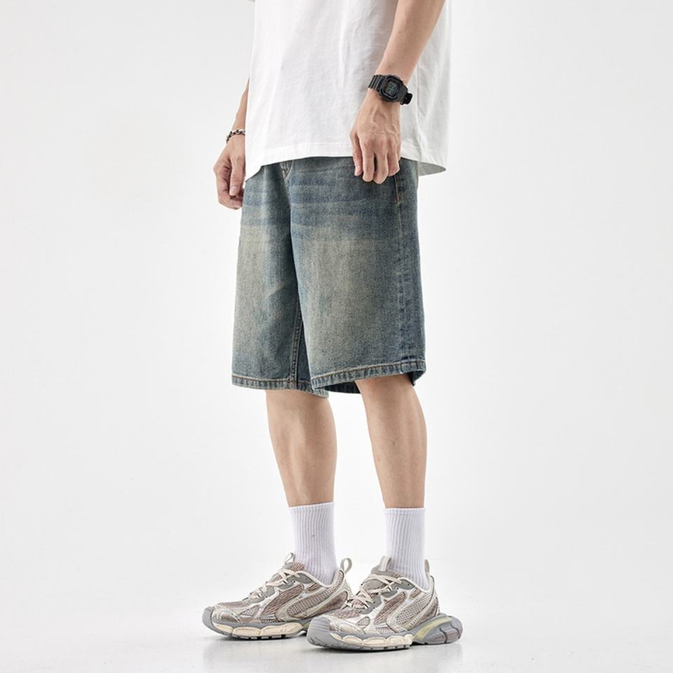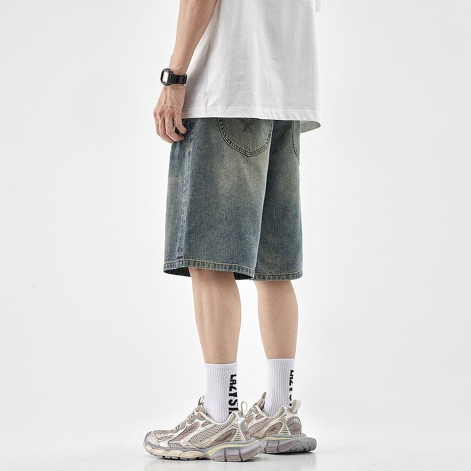 กางเกงยีนส์ขาสั้นผู้ชายสไตล์สตรีทแวร์ฤดูร้อนแบบขายส่ง OEM ผลิตตามสั่ง ระบายอากาศได้ดี สไตล์วินเทจ ทรงหลวม เหมาะสำหรับทำงาน ลายเรียบ