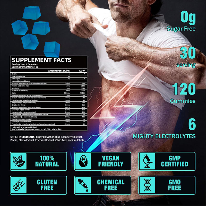 ขายส่ง OEM แบรนด์ส่วนตัว ผลิตภัณฑ์เสริมอาหารกัมมี่อิเล็กโทรไลต์สำหรับผู้ใหญ่ 100% จากธรรมชาติ ปราศจากส่วนผสมของสัตว์ 830 มก. เพิ่มพลังงาน 120 เม็ด