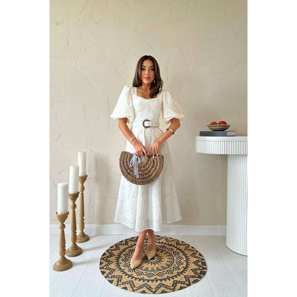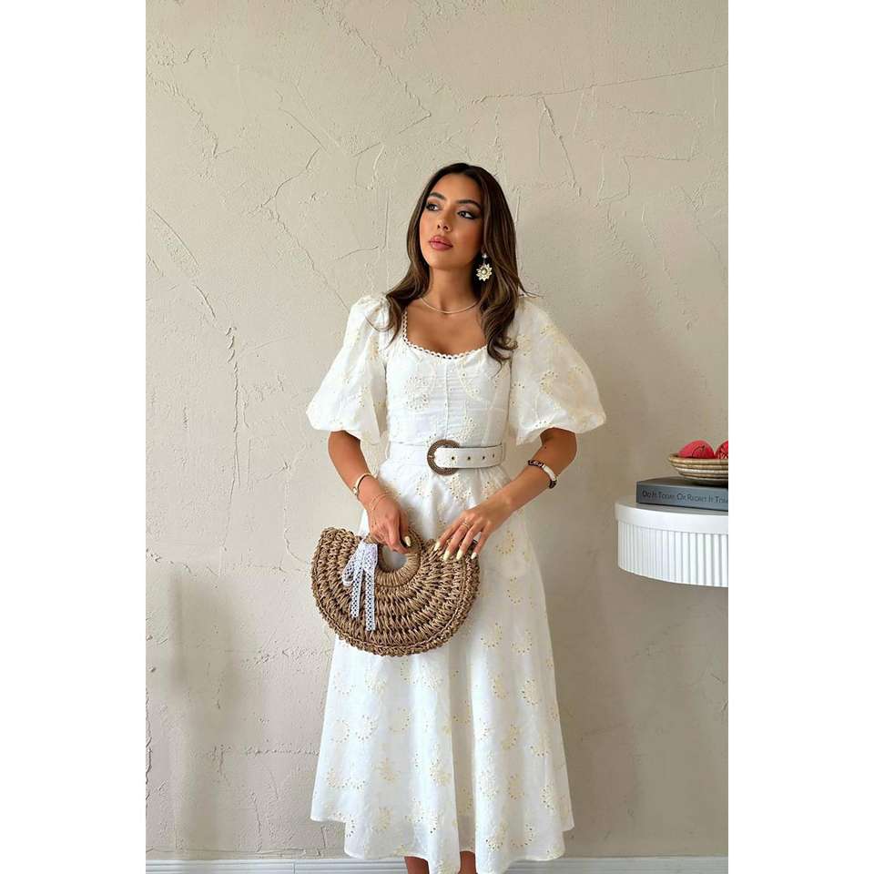 เดรสทรงเอปักลายสีขาวนวล คอทรงโอ เอวธรรมชาติ ผ้าทอระบายอากาศดี เหมาะสำหรับวันหยุดและงานเฉลิมฉลอง สไตล์ลำลอง ขายส่ง