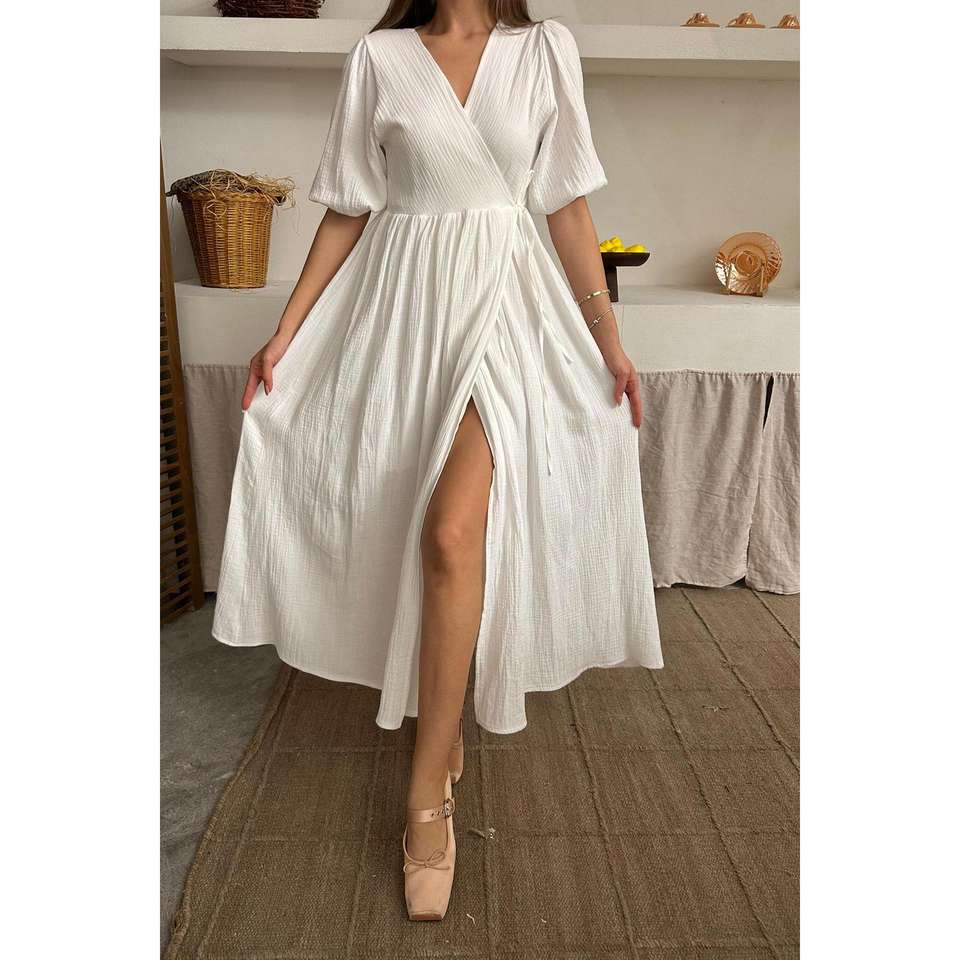 Wholesale Off White Muslin Long Dress V Neck A Line Slit Breathable Casual Daily Wear