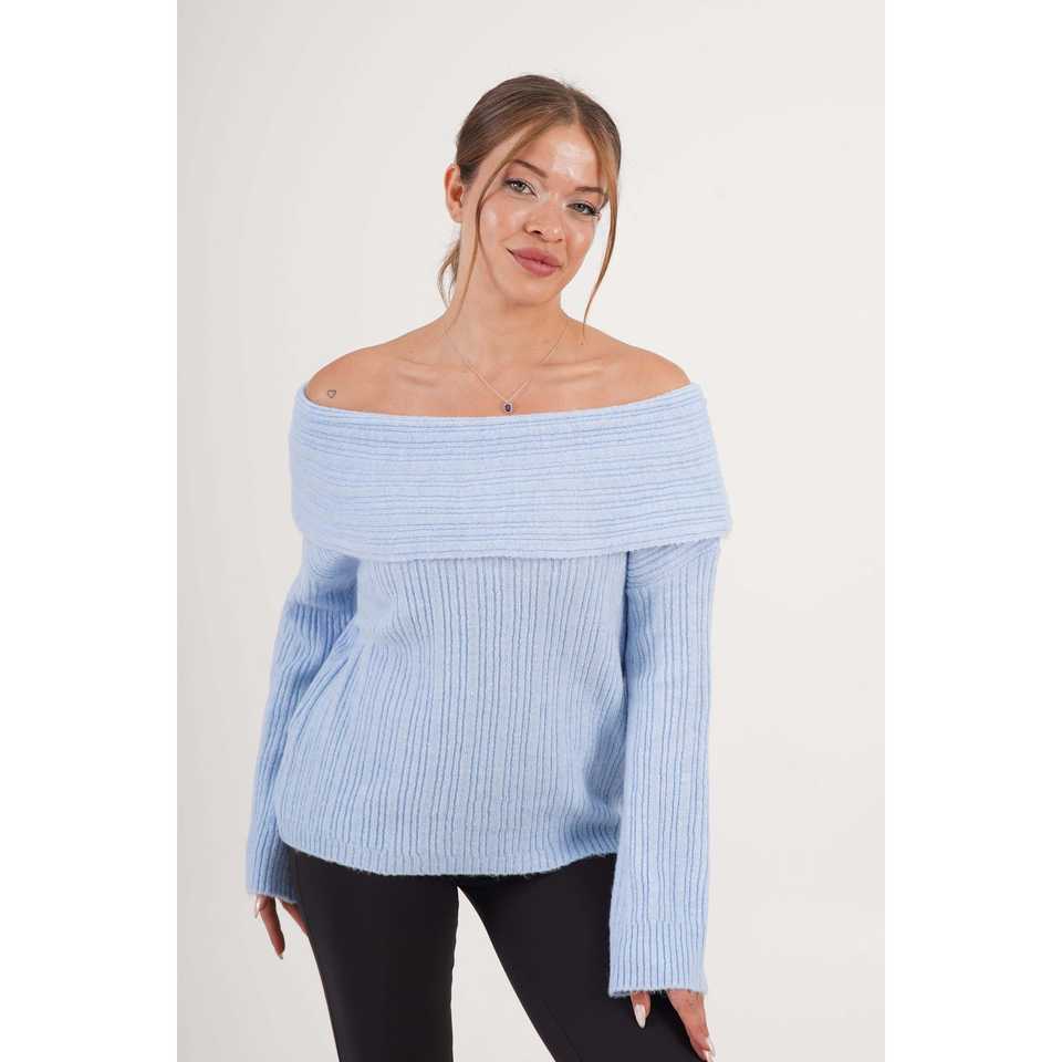 Wholesale Off-the-Shoulder Madonna Neck Baby Blue Knitted Sweater Casual Style