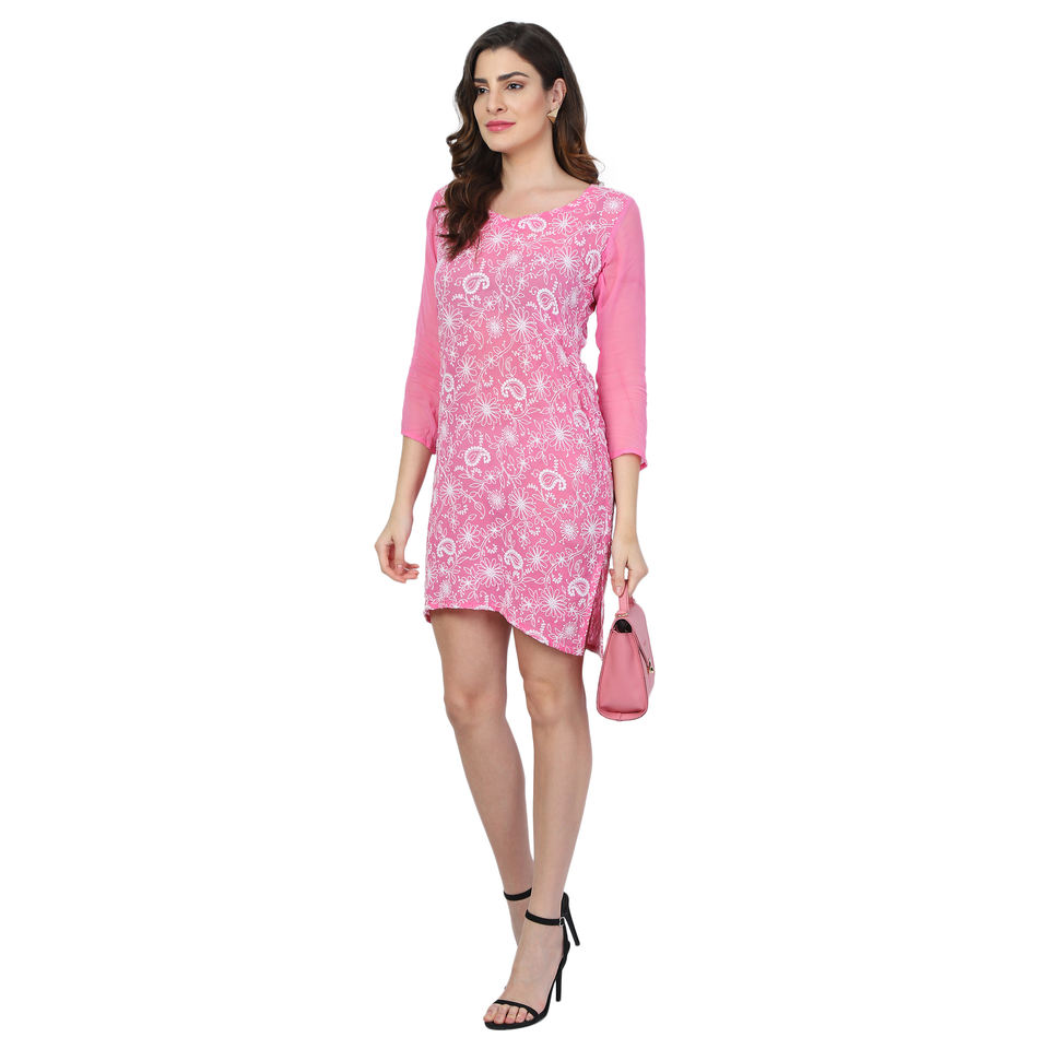 ชุดเดรสลำลองผ้าจอร์เจียสีชมพูแบบชิ้นเดียวพิมพ์ลายปักลวดลายชายหาดชุดว่ายน้ำฟิตเนส