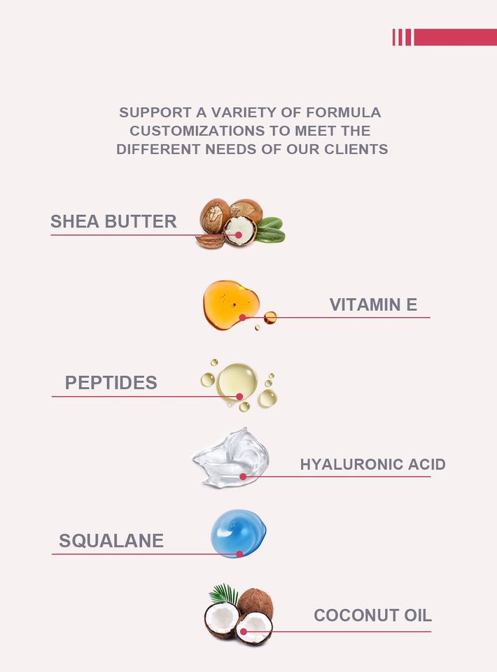 สูตร:เชียบัตเตอร์, วิตามิน, เปปไทด์, กรดไฮยาลูโรนิก, สควาเลน, น้ำมันมะพร้าว