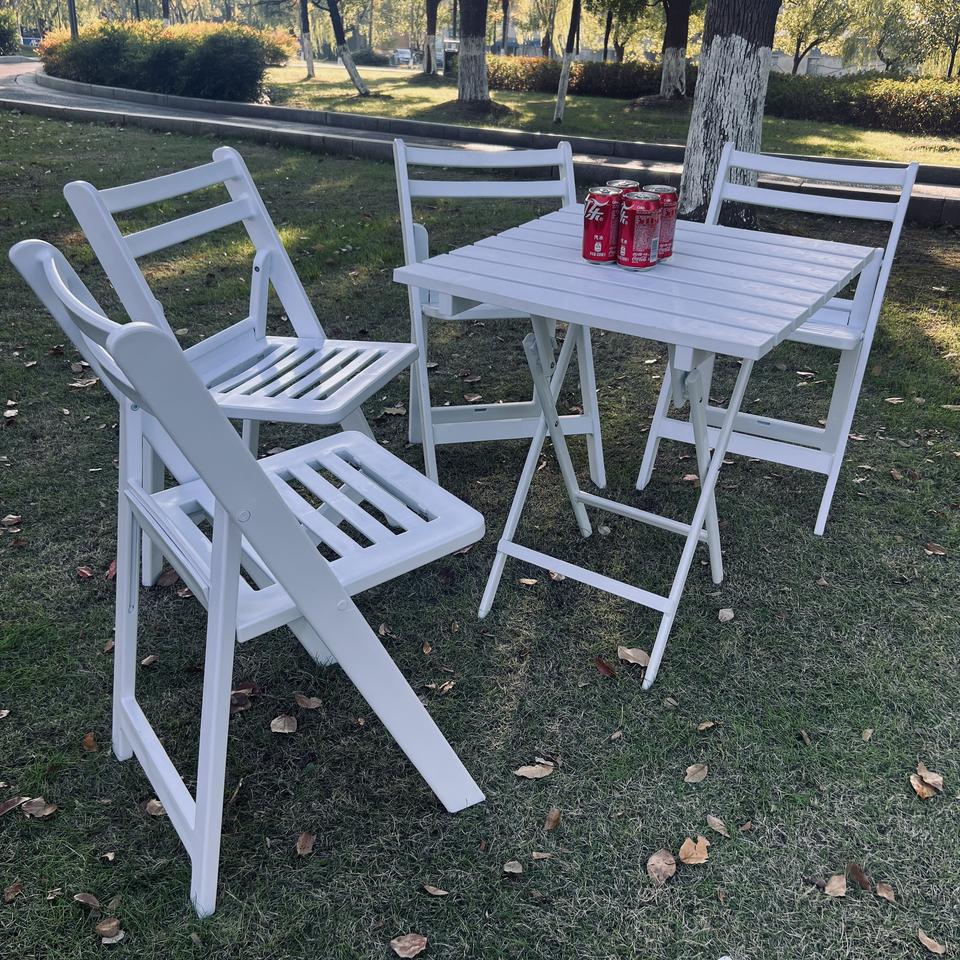 คำอธิบาย:โต๊ะเรซินไม้และเก้าอี้พับพลาสติกสองตัว