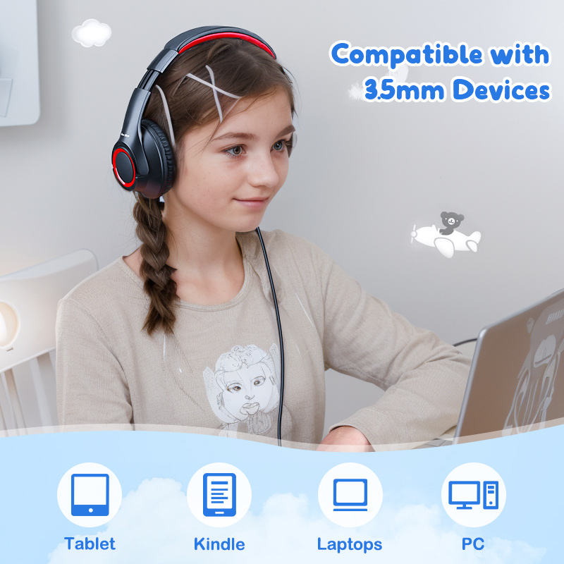 หูฟังครอบหูสำหรับเด็กสายรัดศีรษะแบบปรับได้3.5มม. หูฟังสำหรับการเรียนรู้ในโรงเรียน