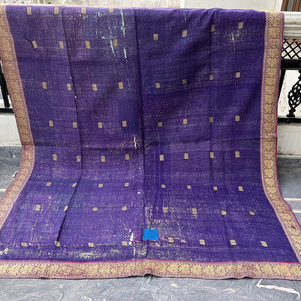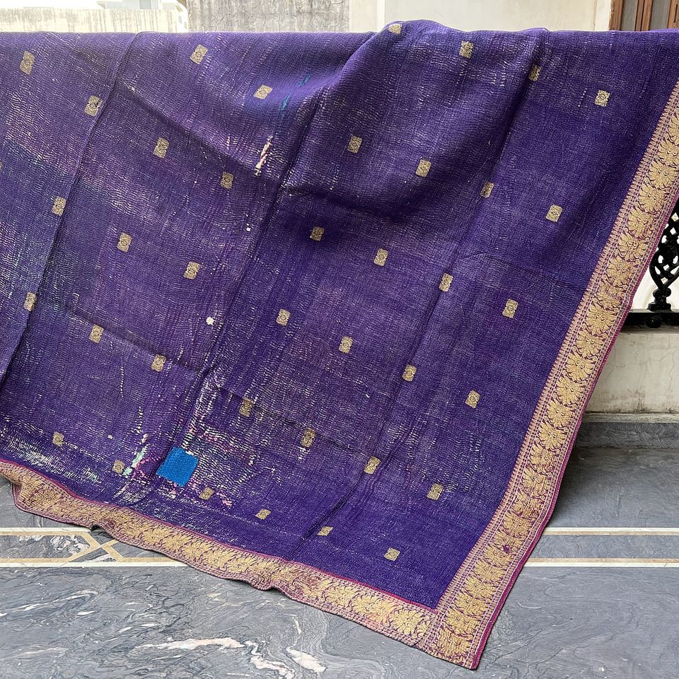 ผ้าเย็บต่อกันแบบเย็บมือทรงอินเดีย,ผ้าปูที่นอน Kantha แบบวินเทจสีม่วง