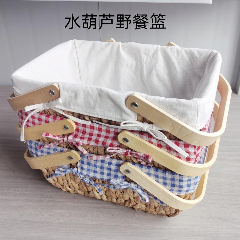 ตะกร้าปิกนิกขายส่ง ทรงสี่เหลี่ยม ทำจากหวายสาน พร้อมหูหิ้วไม้ บุลายตารางสีขาว น้ำเงิน แดง สะดวกสำหรับการจัดเก็บ