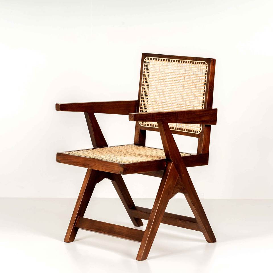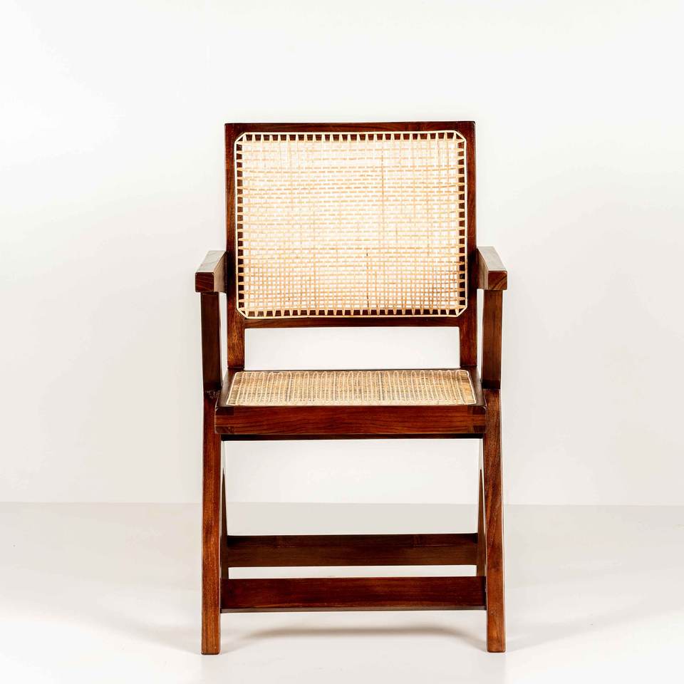 เก้าอี้ไม้สไตล์ Pierre Jeanneret แบบขายส่ง ขา X พร้อมที่วางแขน หุ้มด้วยหวายธรรมชาติ สำหรับห้องรับประทานอาหารและห้องทำงาน