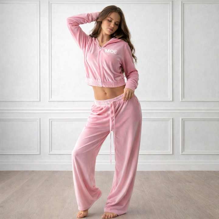 ชุดวอร์มสีชมพูประดับเพชรทั้งตัว ระบายอากาศได้ดี เสื้อครอปโอเวอร์ไซส์ กางเกงขายาวทรงบาน ชุดสองชิ้น รับผลิตตามสั่ง OEM