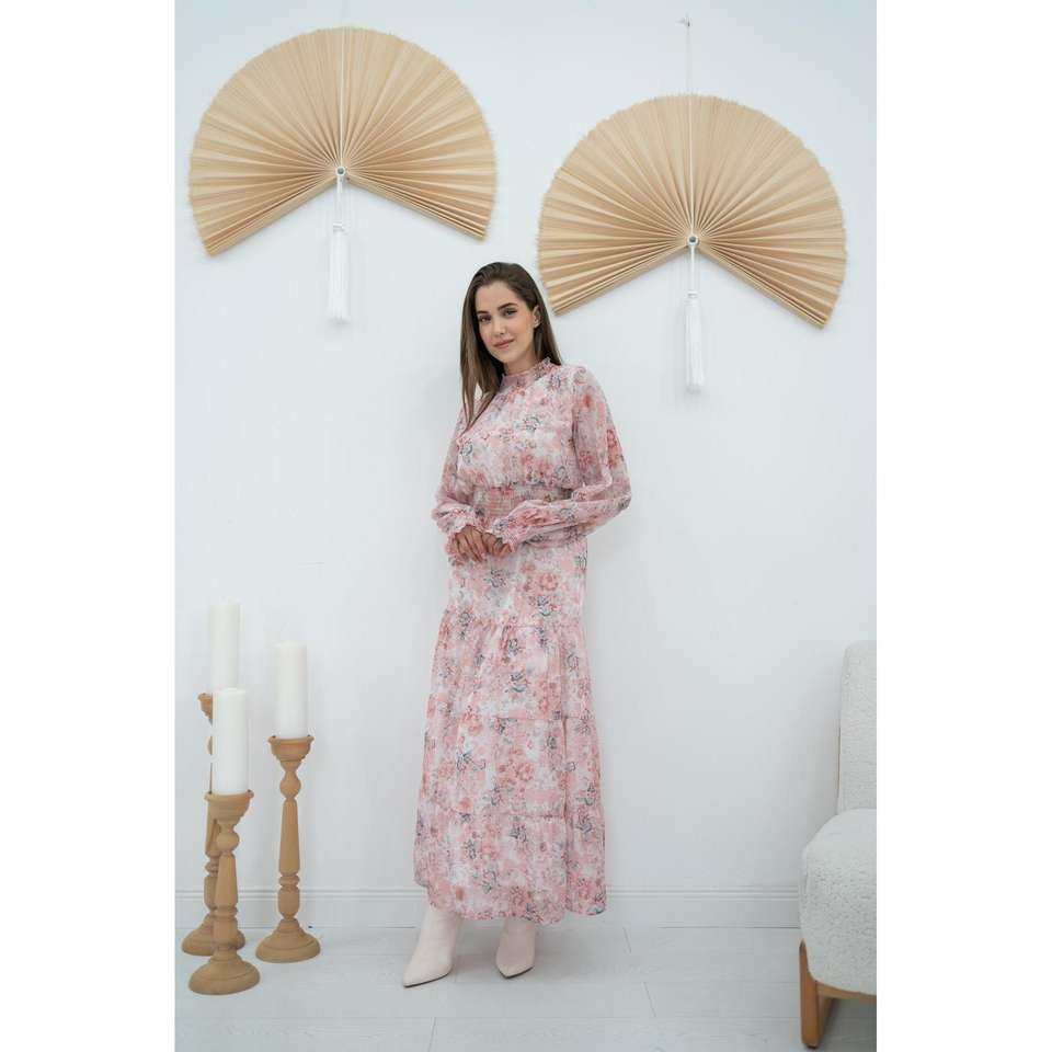 เดรสทรงเอพิมพ์ลายดอกไม้สีชมพูขายส่ง แบรนด์ Champs-lyses เอวธรรมชาติ ผลิตจากผ้าชีฟอง