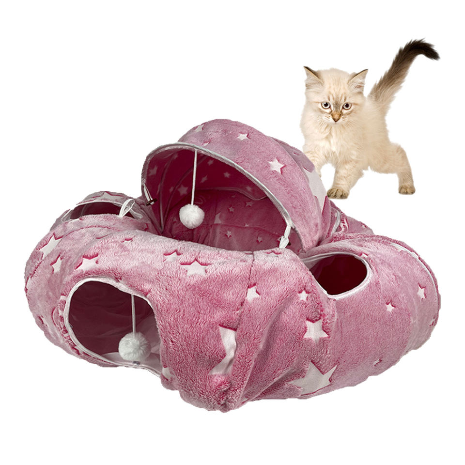 อุโมงค์โดนัทแมวพับได้ผ้ากำมะหยี่ดีไซน์รูปดาวสีชมพู