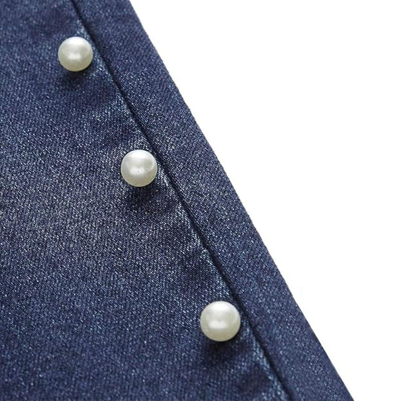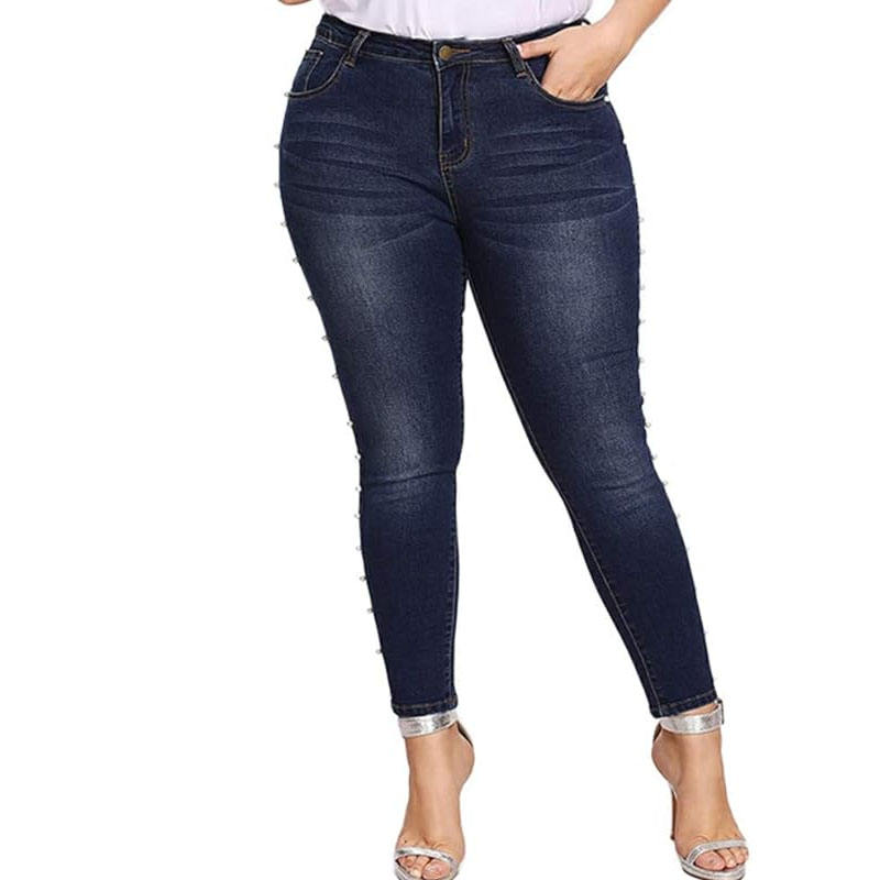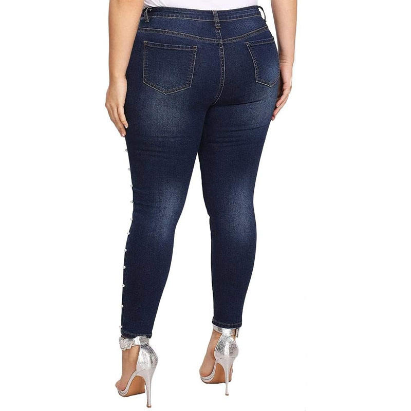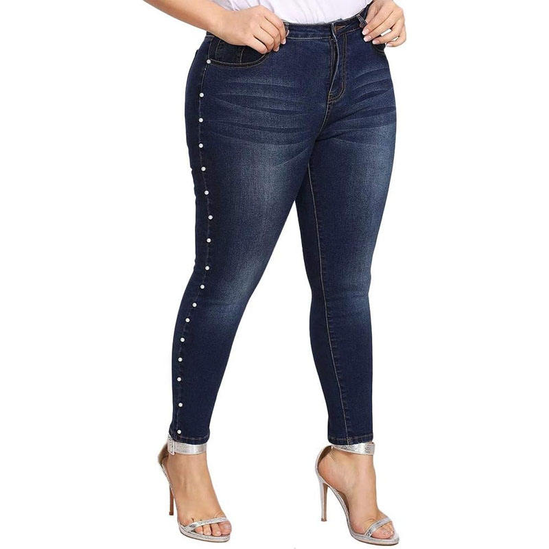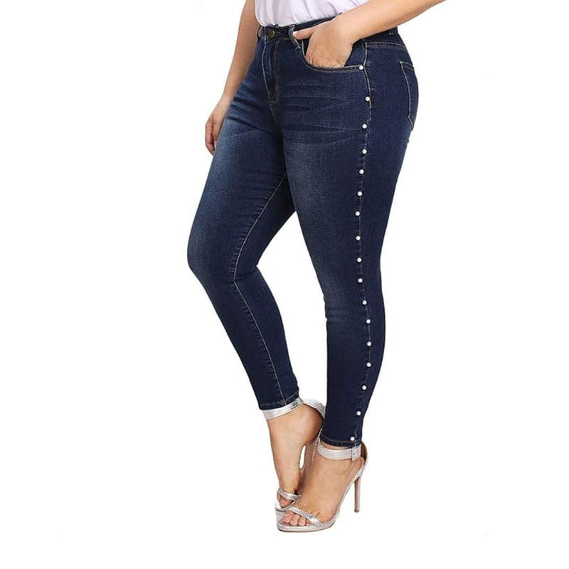 กางเกงยีนส์เอวสูงทรงสกินนี่สำหรับผู้หญิงไซส์ใหญ่ ขายส่ง พร้อมแถบข้างประดับมุกสุดเก๋ ผ้ายีนส์ยืดใส่สบายสำหรับผู้หญิง