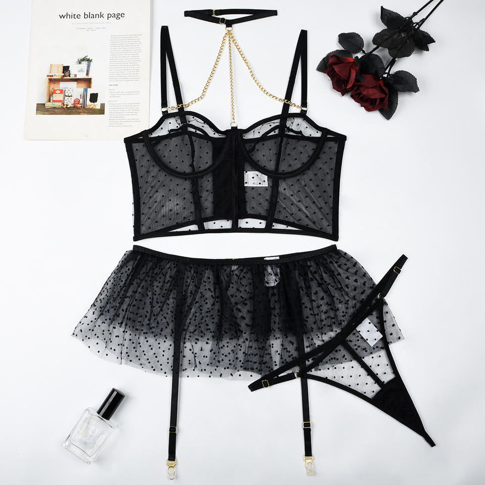 Wholesale Polka Dot See-through Mesh Three Piece Lingerie Set New Arrival Fish-bone Solid Color Underwear Set